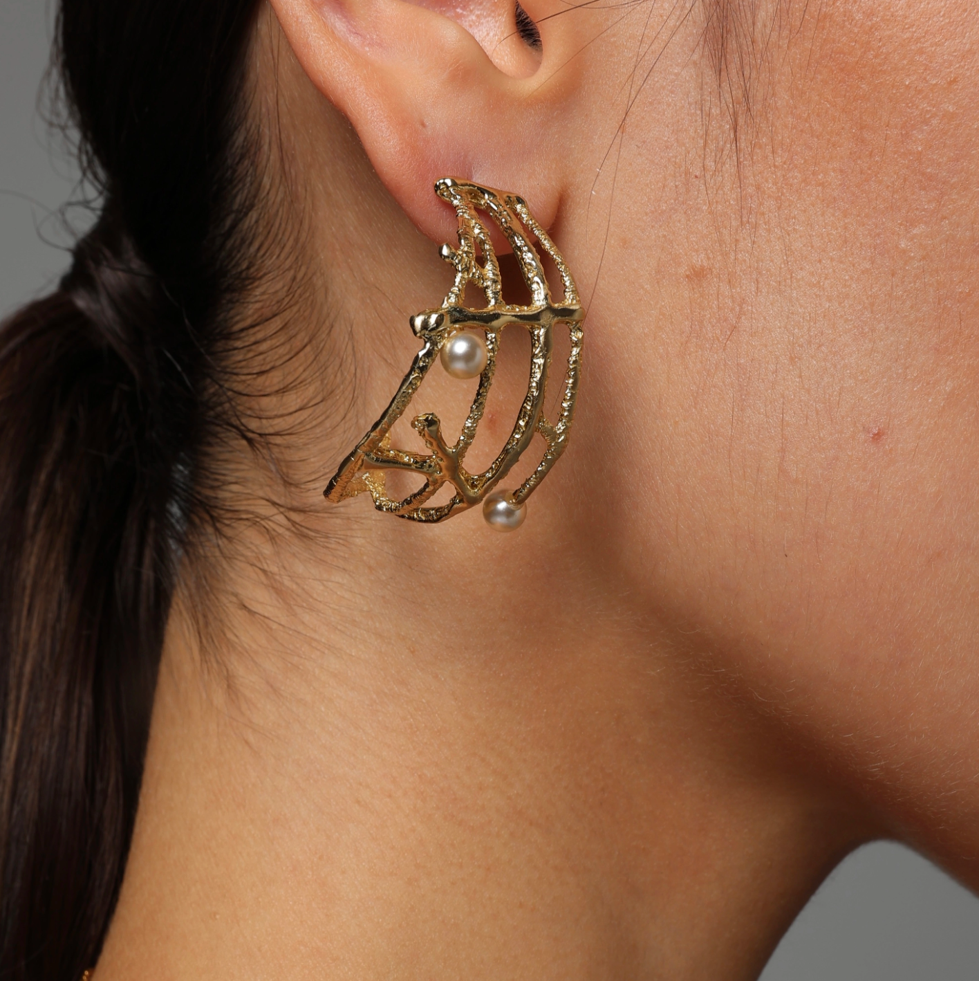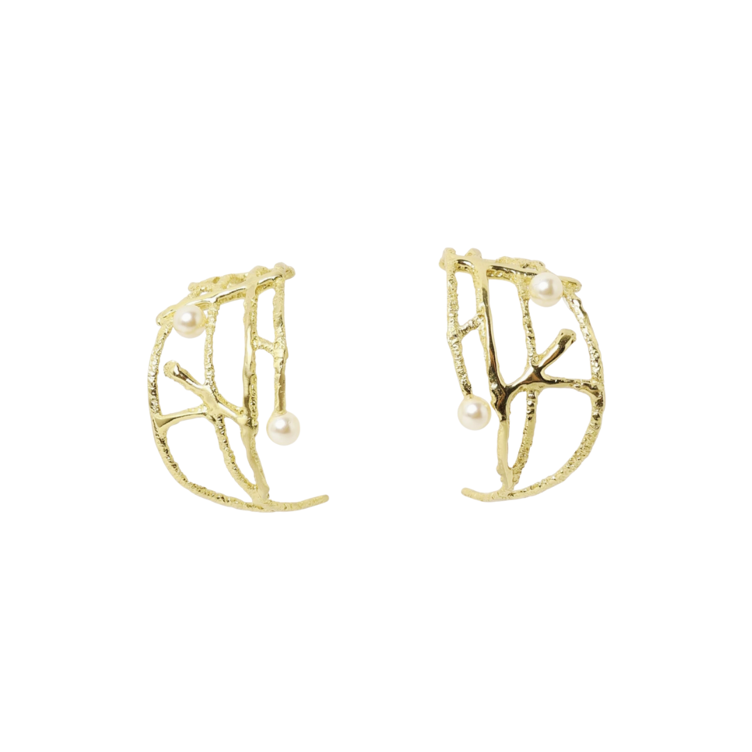 Crescent Pearl Studs — Oxidized Silver & Gold Detail