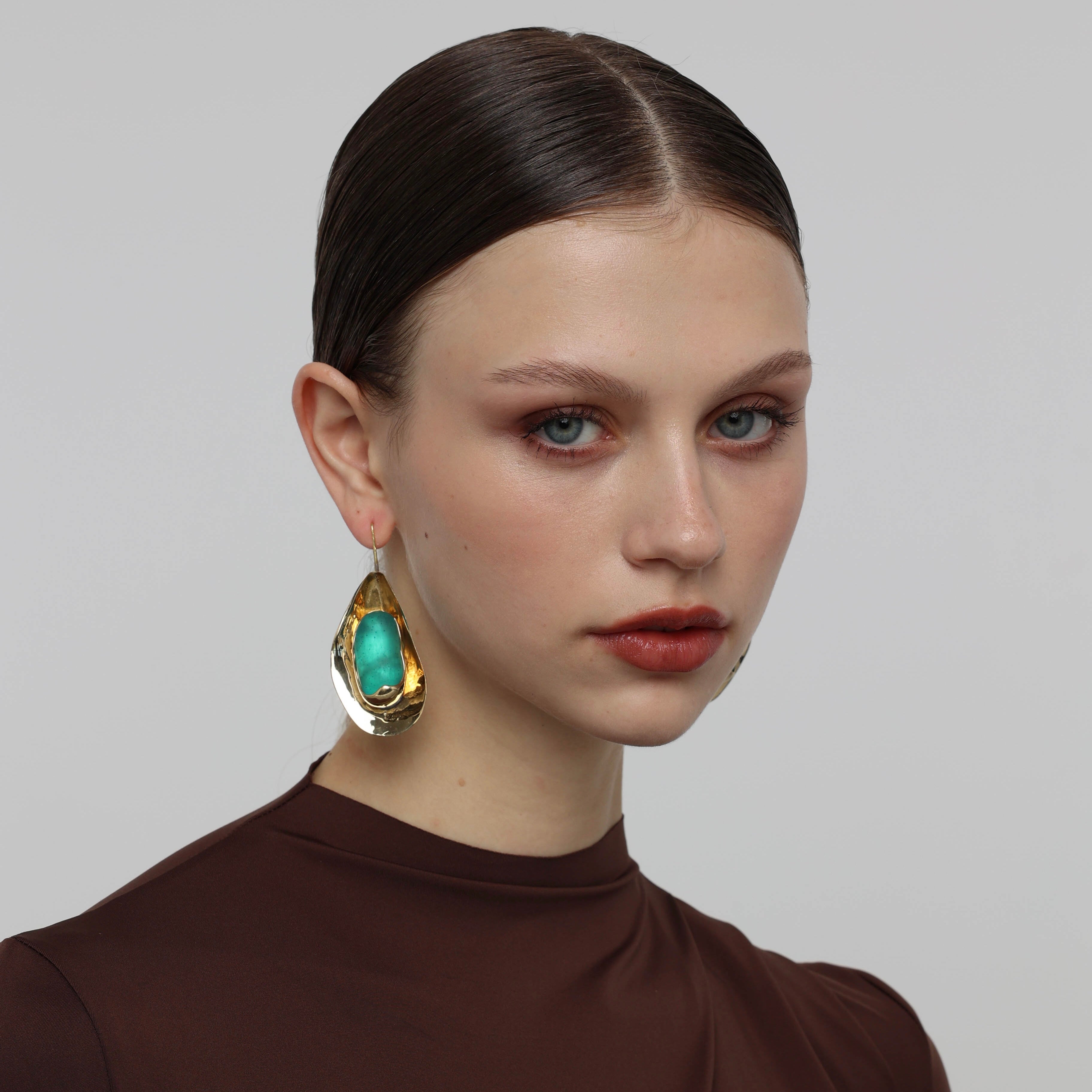 Embrace the essence of ocean tides with these brass drop earrings, each cradling a smooth marine-hued resin accent. Their fluid, layered silhouette echoes the gentle curves of a shoreline, while hypoallergenic, nickel-free construction ensures comfort and durability for everyday wear.