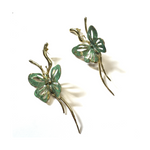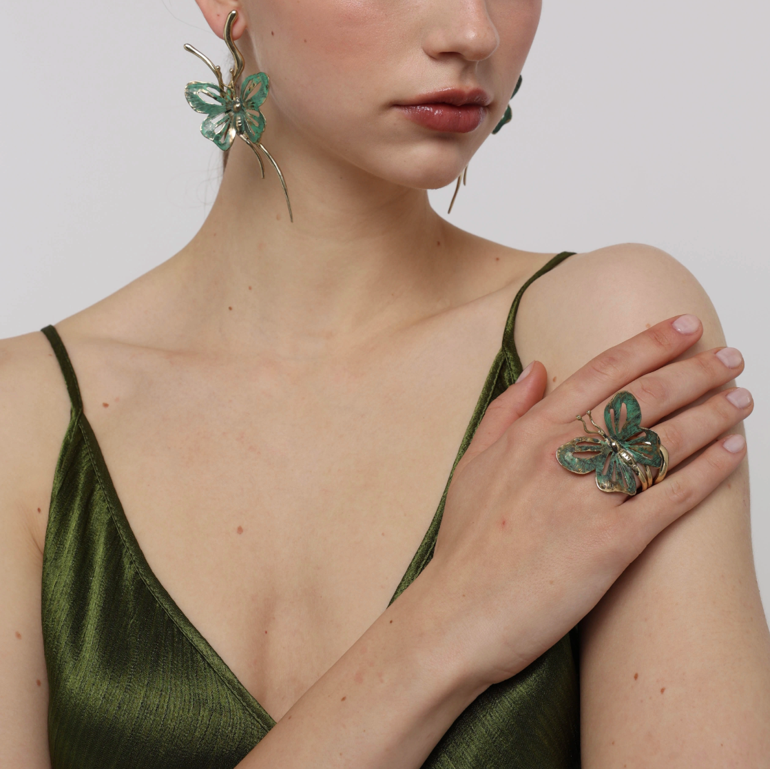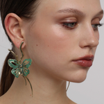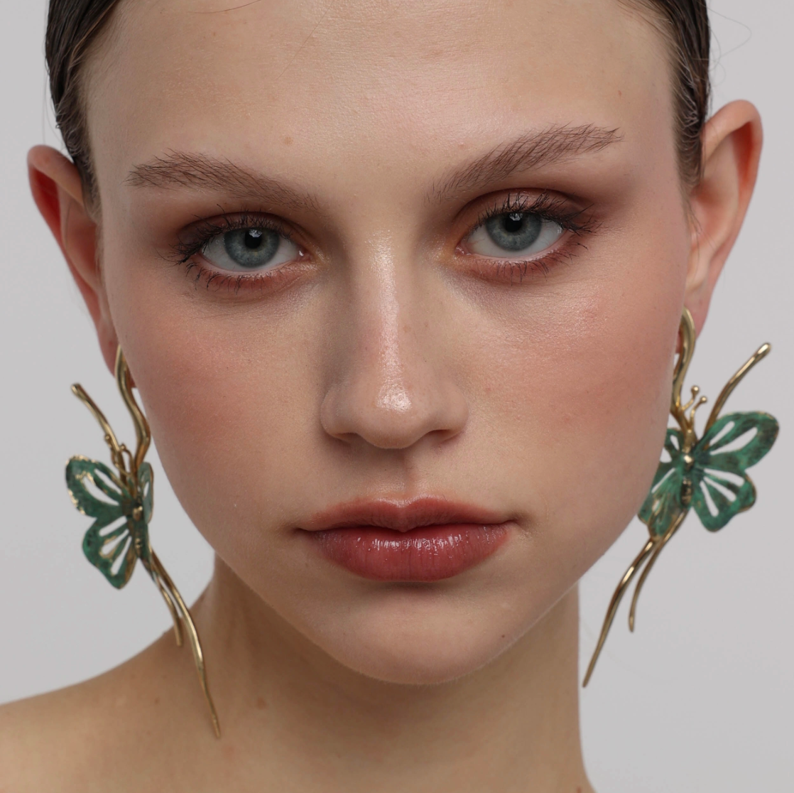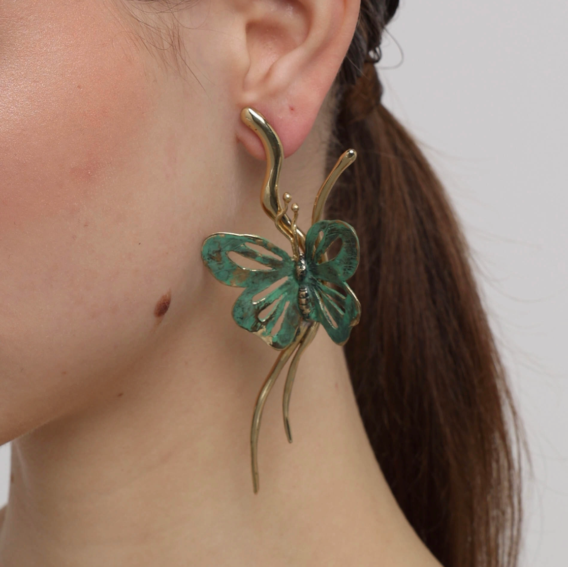 hese dramatic shoulder-grazing earrings are alive with movement. Each butterfly rests on a slender branch-like arc that curves elegantly along the neck. Lightweight yet bold, they’re wearable art for the wild-hearted.