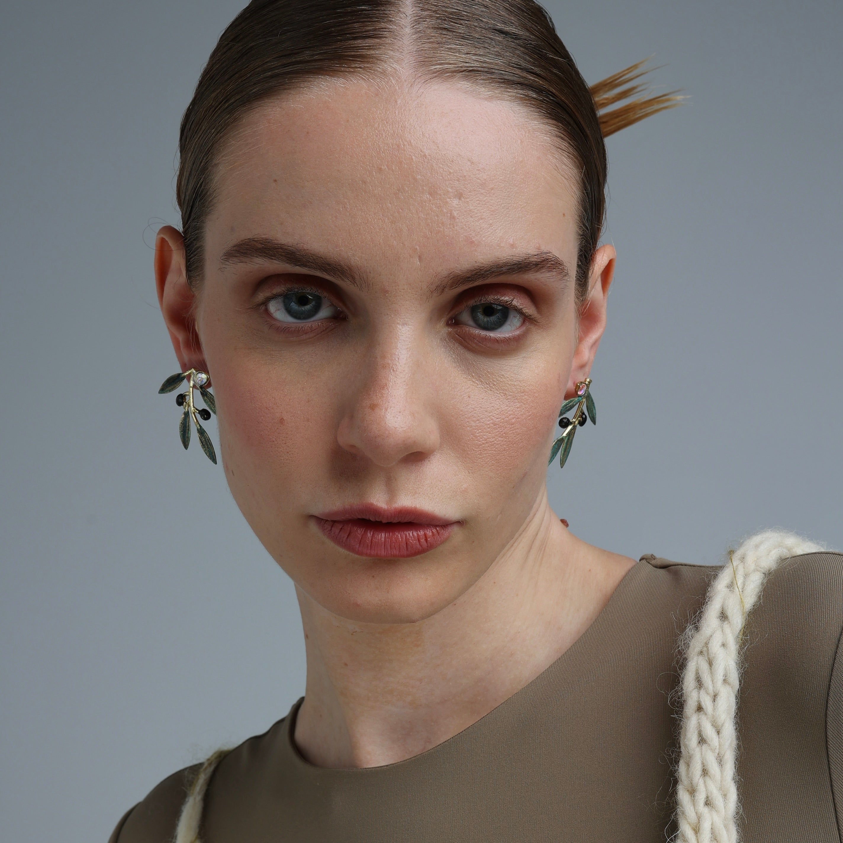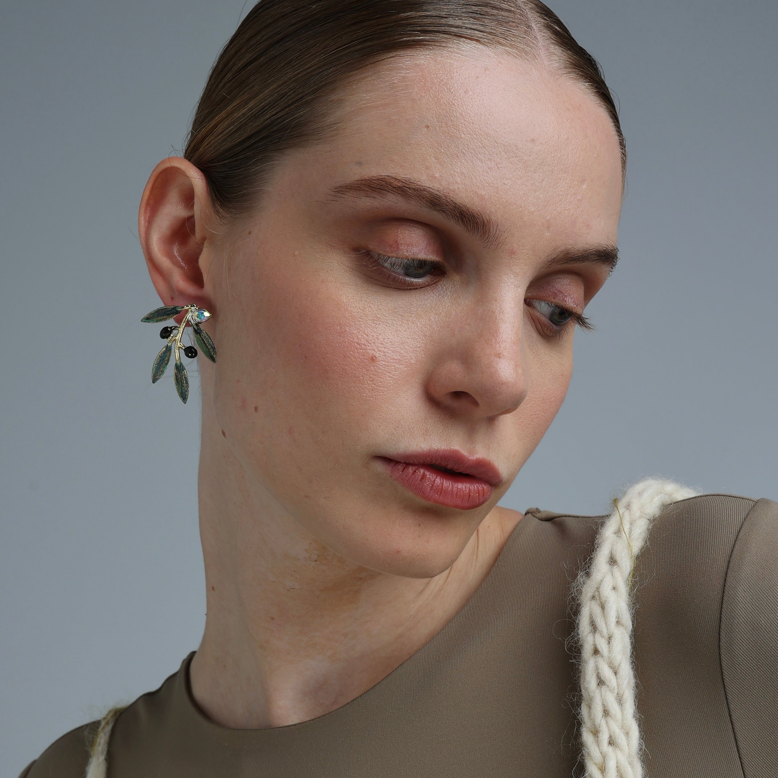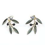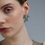 These botanical studs feature hand-painted olive leaves, tiny matte black olives, and a subtle crystal accent that catches the light just so. Crafted in brass with a soft green oxidation finish, they sit gracefully on the ear—perfect for everyday wear with meaning.