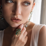 Lush with texture and movement, the Harmony Leaf Ring brings together nature’s elegance and artisan detail. Green-patinated brass leaves fan out around a marquise-cut emerald crystal, creating a layered, organic silhouette that feels both grounded and alive.