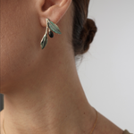 Delicate and quietly symbolic, these small drop earrings feature a miniature olive branch with softly patinated green leaves and tiny black olives. Hand-sculpted in brass and carefully painted by hand, the design captures the gentle movement and natural beauty of an olive branch in a refined, wearable scale.