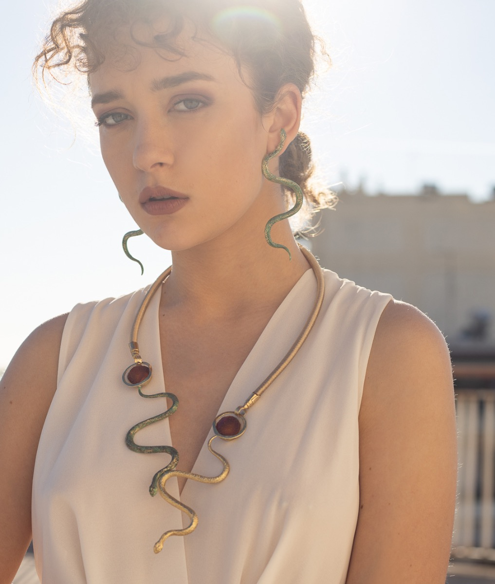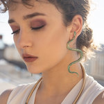 A fierce twist on a classic symbol. These green-patinated serpent earrings blend ancient power with a modern edge. The hand-applied oxidation gives them a richly textured, almost mystical finish—like something unearthed from a forgotten world.