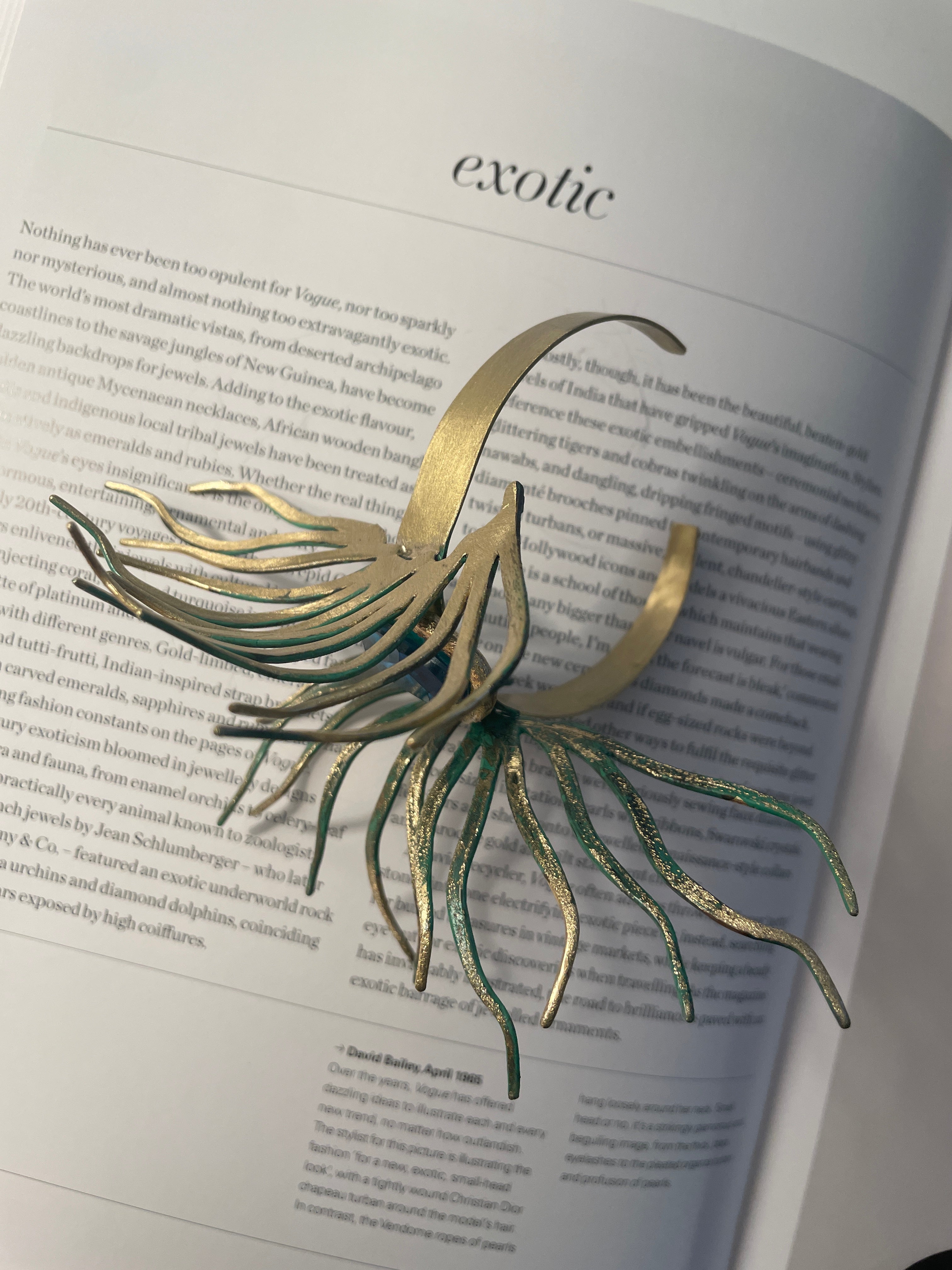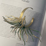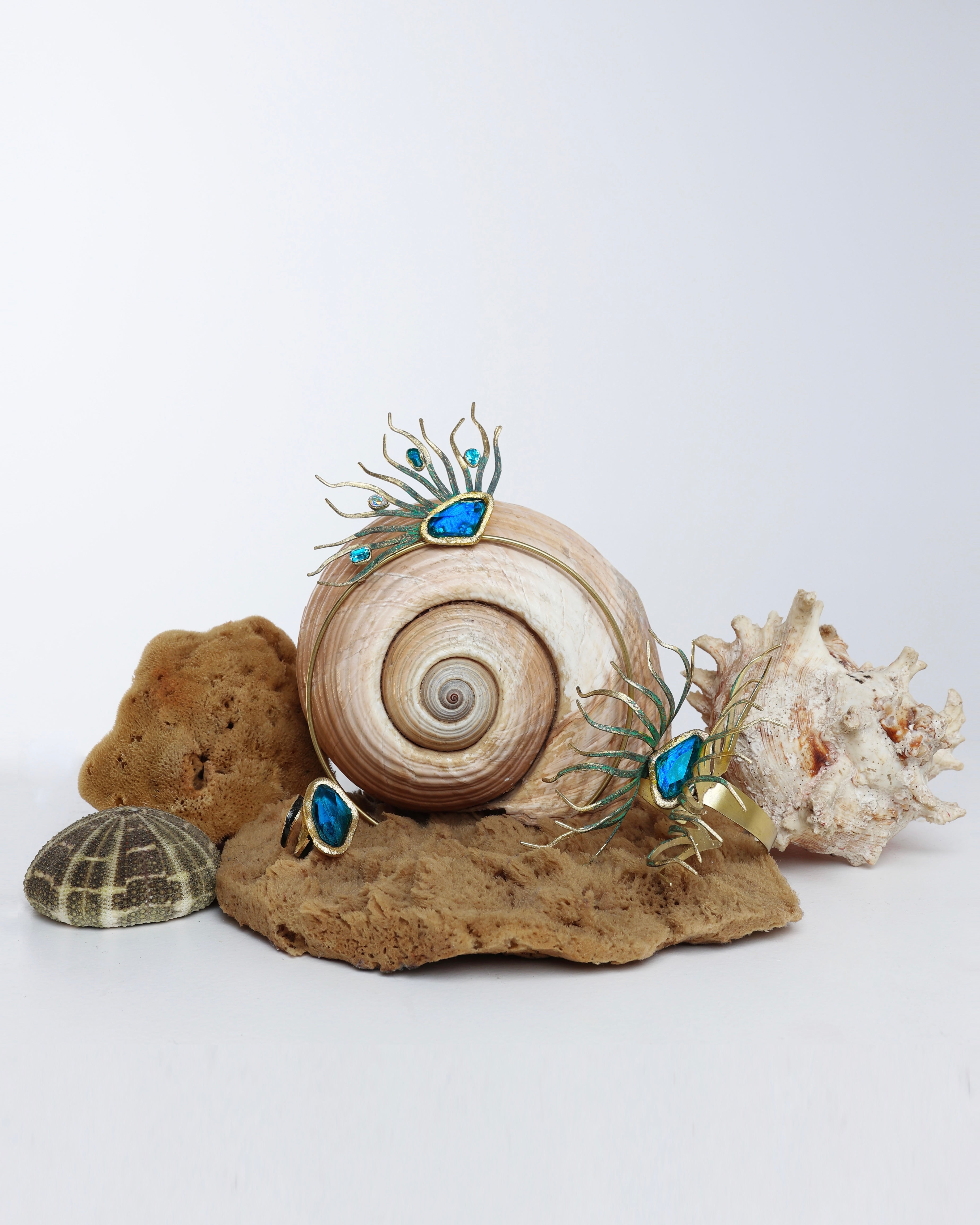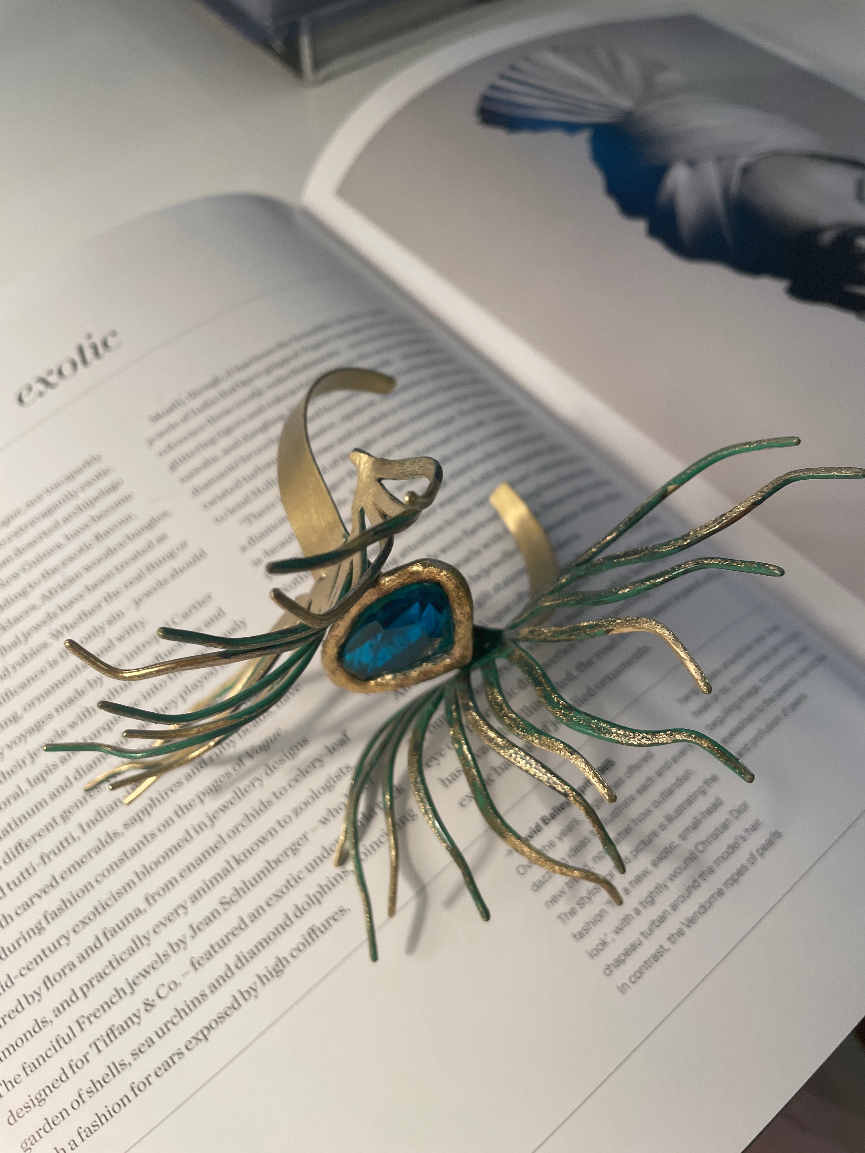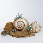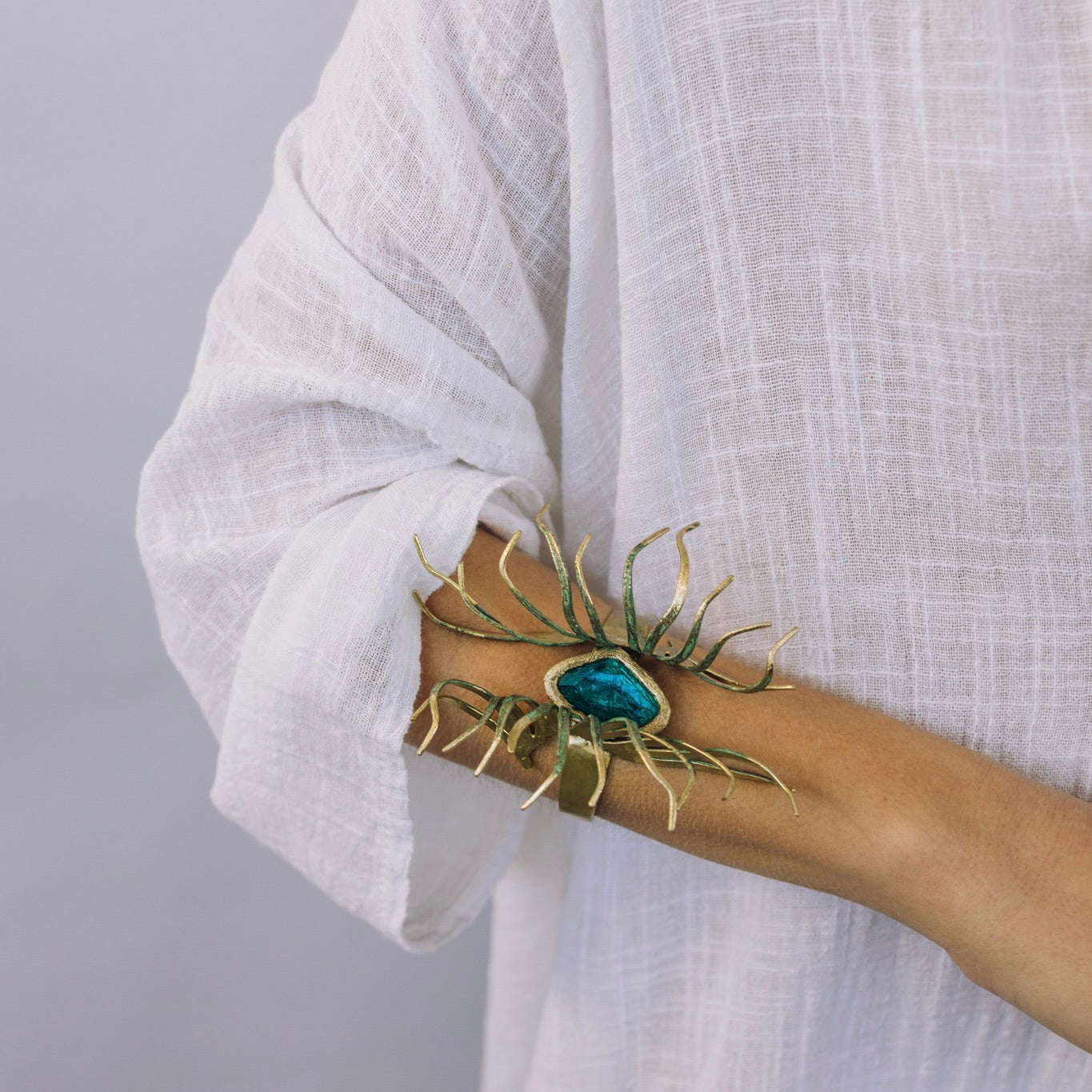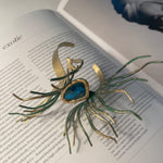 Our Amphitrite bracelet embodies a captivating balance of delicacy and boldness. Its uncommon marine-inspired design showcases a vibrant turquoise-colored raisin stone, elegantly complemented by gracefully oxidized green tentacles.
