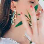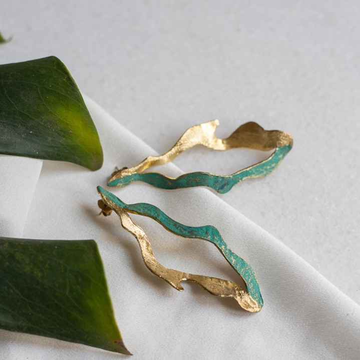 Sculptural and free-flowing, the Zia Earrings feature sinuous brass outlines enhanced by a subtle green oxidation. Their organic shape creates a striking silhouette that catches the light with every turn. Hypoallergenic, nickel-free, and built for lasting wear, they bring a modern, artful twist to any look.