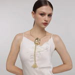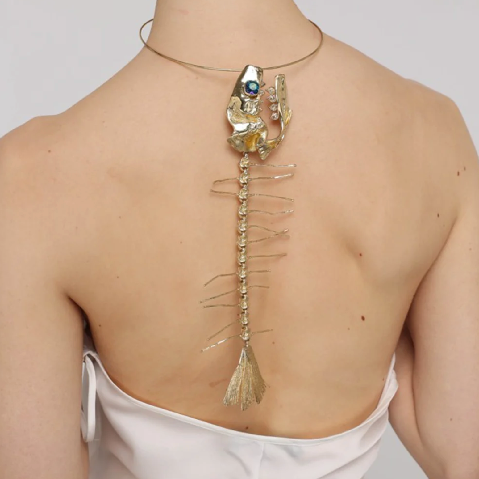 The Large Pisces Spine Choker commands attention with its sculptural, fish-inspired form — a true statement piece handcrafted in brass. A luminous blue zircon crystal glimmers at its center, echoing the light and mystery of the deep sea. With its wide, open silhouette and fluid curves, this piece embodies both strength and grace — wearable art that feels powerful, modern, and alive.