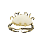 A small sculptural creature rests at the center of this striking ring — a crab formed in textured brass, gently cradling a natural white stone like a treasure found along the shore.