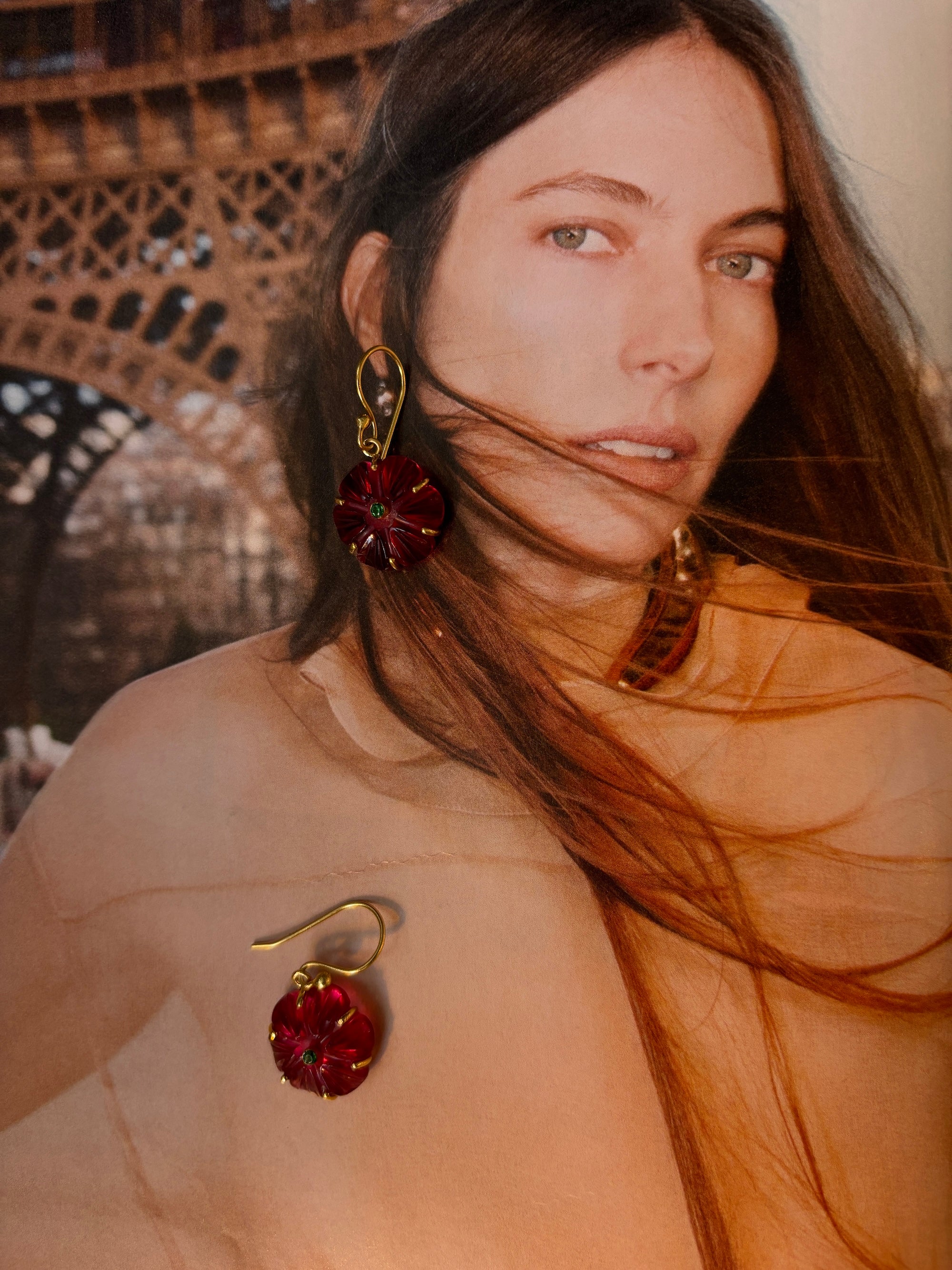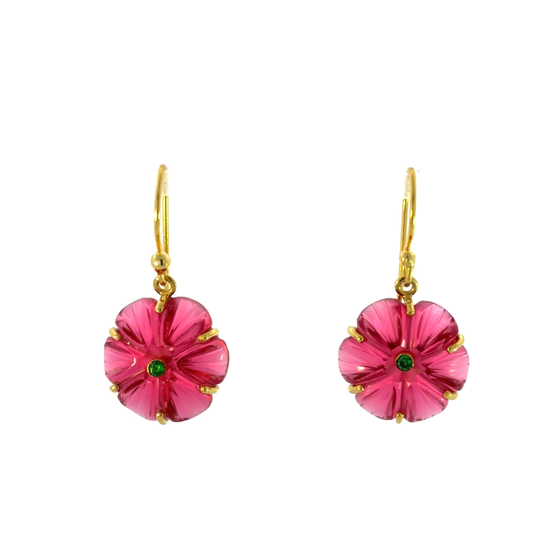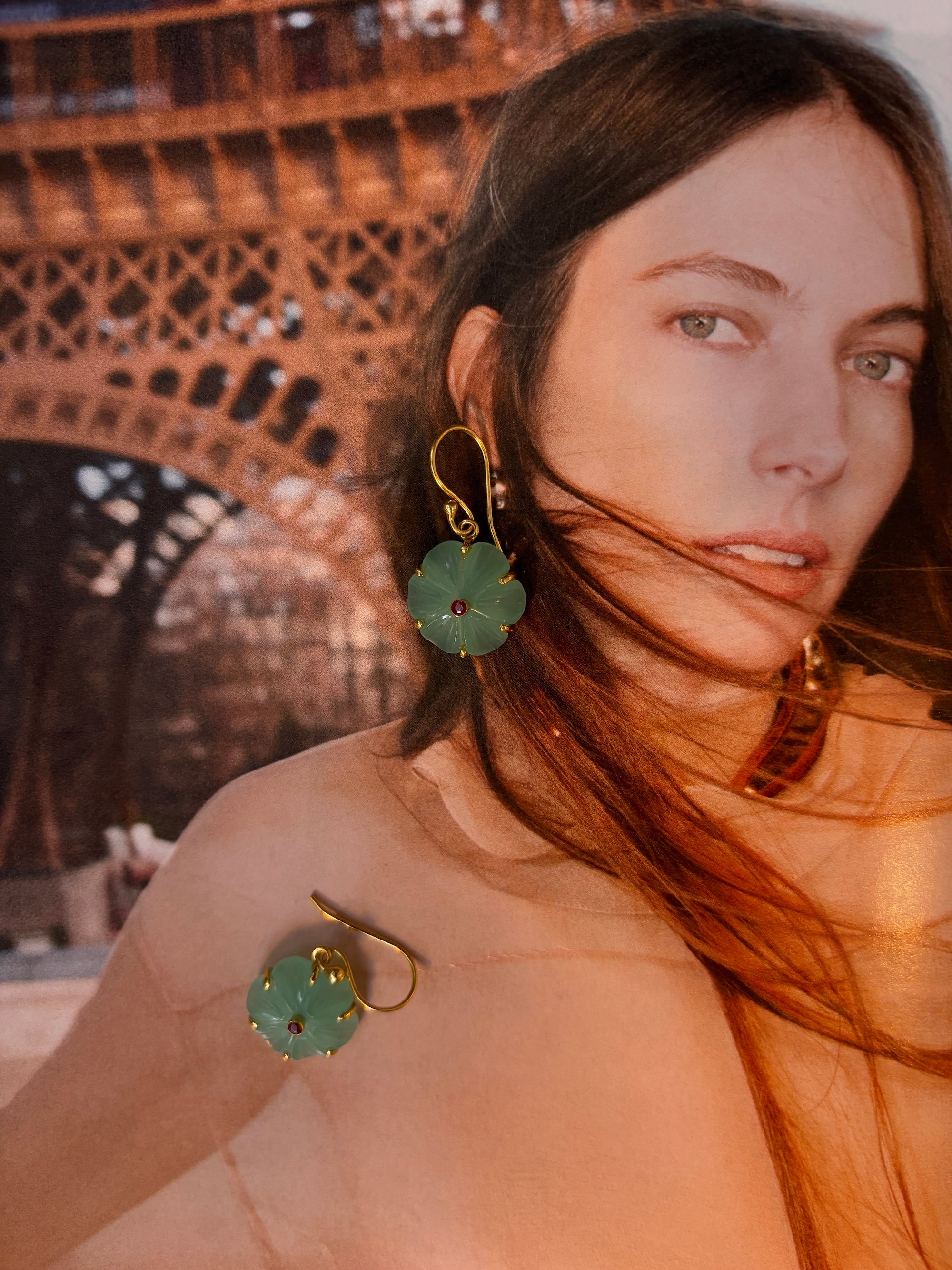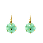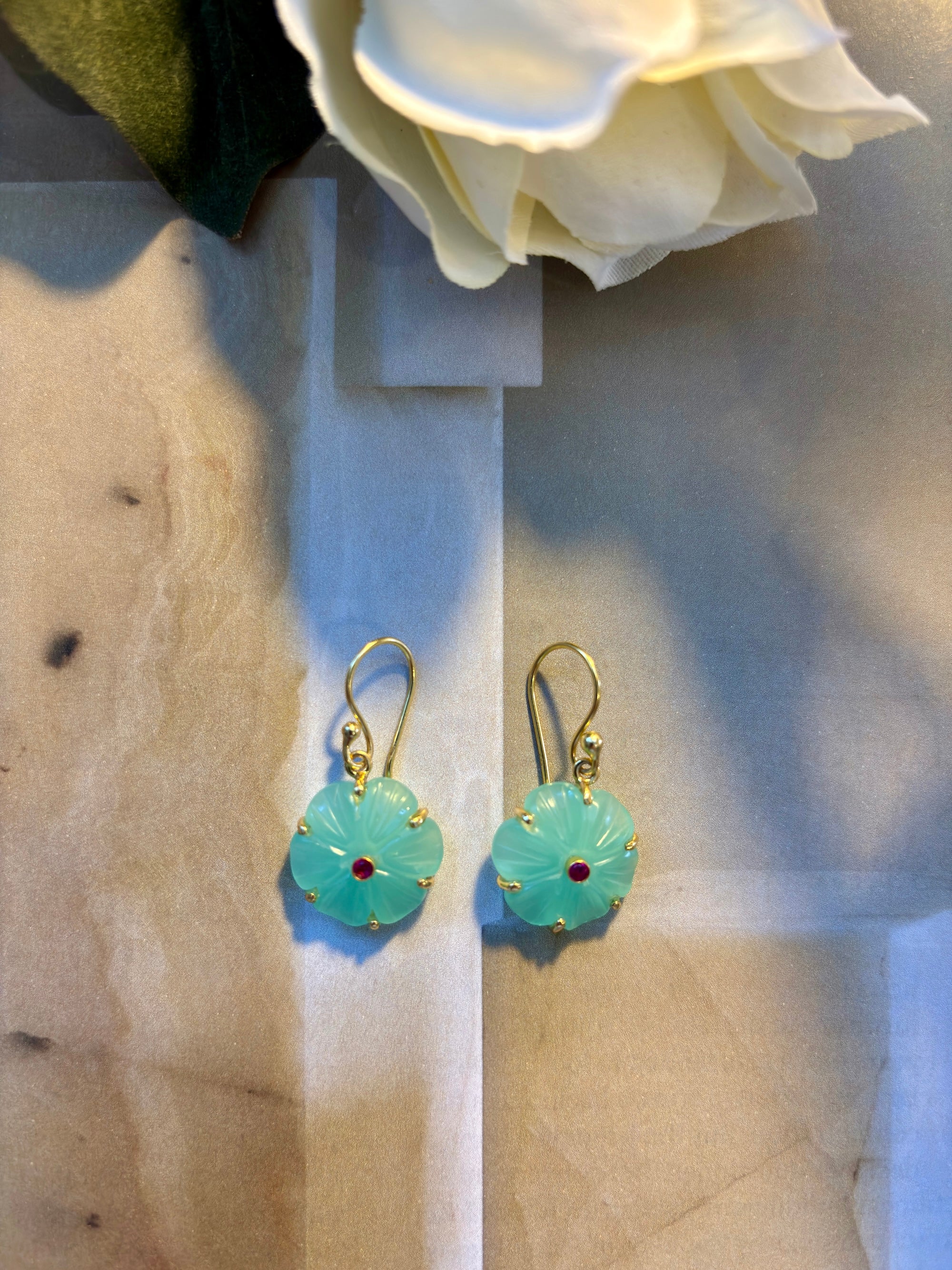 Delightfully chic, these hook earrings feature a graceful drop design showcasing a hand-cut chalcedony flower. Available in lavender, rose pink, or turquoise, each earring is set in 18K gold plated sterling silver for a radiant finish that captures the essence of spring.