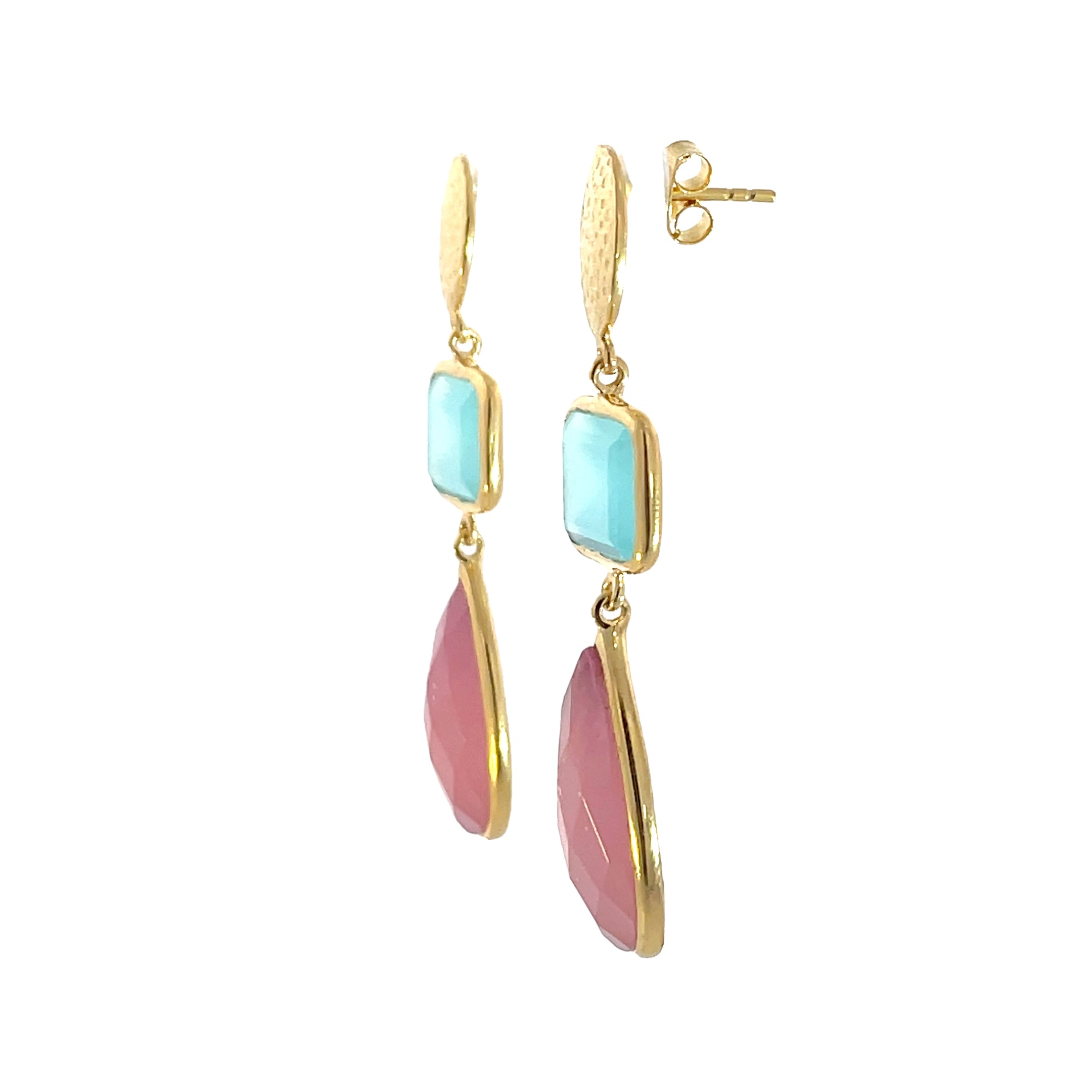 In shades of blue and pink, our Lindsey dangle earrings feature faceted Chalcedony stones. With graceful movement, these earrings are perfect for everyday wear.