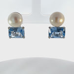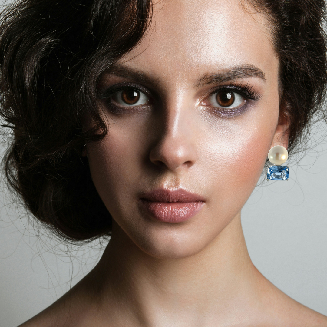 Soft skies and quiet glamour. This luminous pairing features a 13mm freshwater pearl alongside a radiant simulated sky blue topaz in a crisp emerald cut. Set in rhodium-plated sterling silver and finished with our signature omega backs, the Lucienne Studs offer a graceful lift and a delicate brilliance that feels both ethereal and modern.