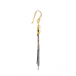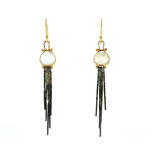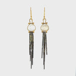 These dramatic, yet whisper-light earrings pair the ethereal glow of natural rainbow moonstone with long, oxidized sterling silver fringe. Set in 18K gold-plated bezels atop a sterling silver base, each moonstone radiates a soft, inner light—perfectly contrasted by the cascading dark silver strands that sway with every step.