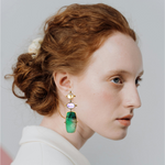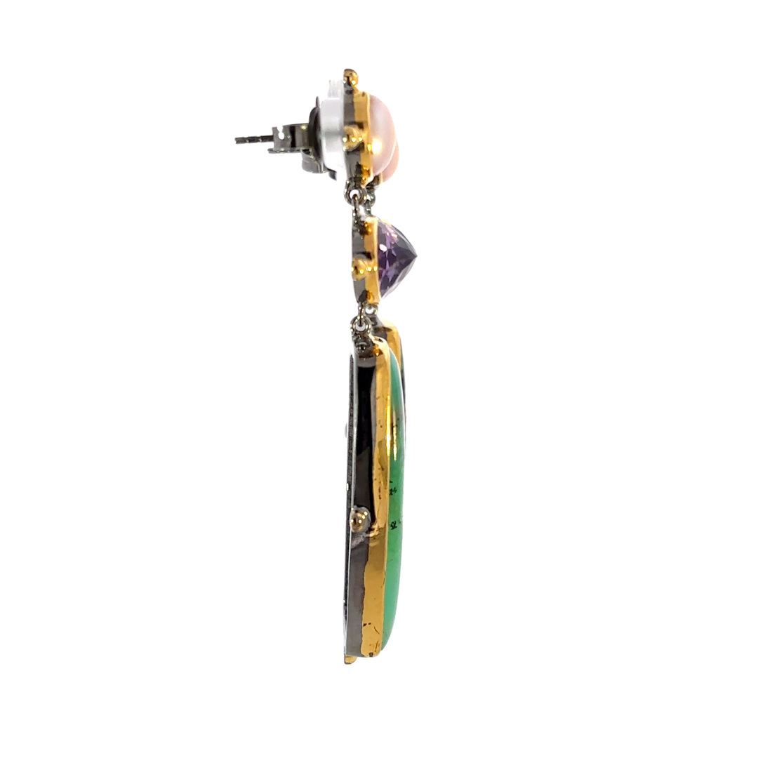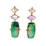 A story in three stones: this singular earring layers soft luster, deep violet, and vivid sea green in a vertical, sculptural design. At the top, a luminous freshwater pearl nestles against a gold-accented setting. Below it, a marquise-cut amethyst glows with mystery. The final drop—a richly veined slab of chrysoprase—anchors the piece with its oceanic depth and one-of-a-kind patterning.