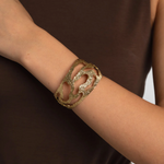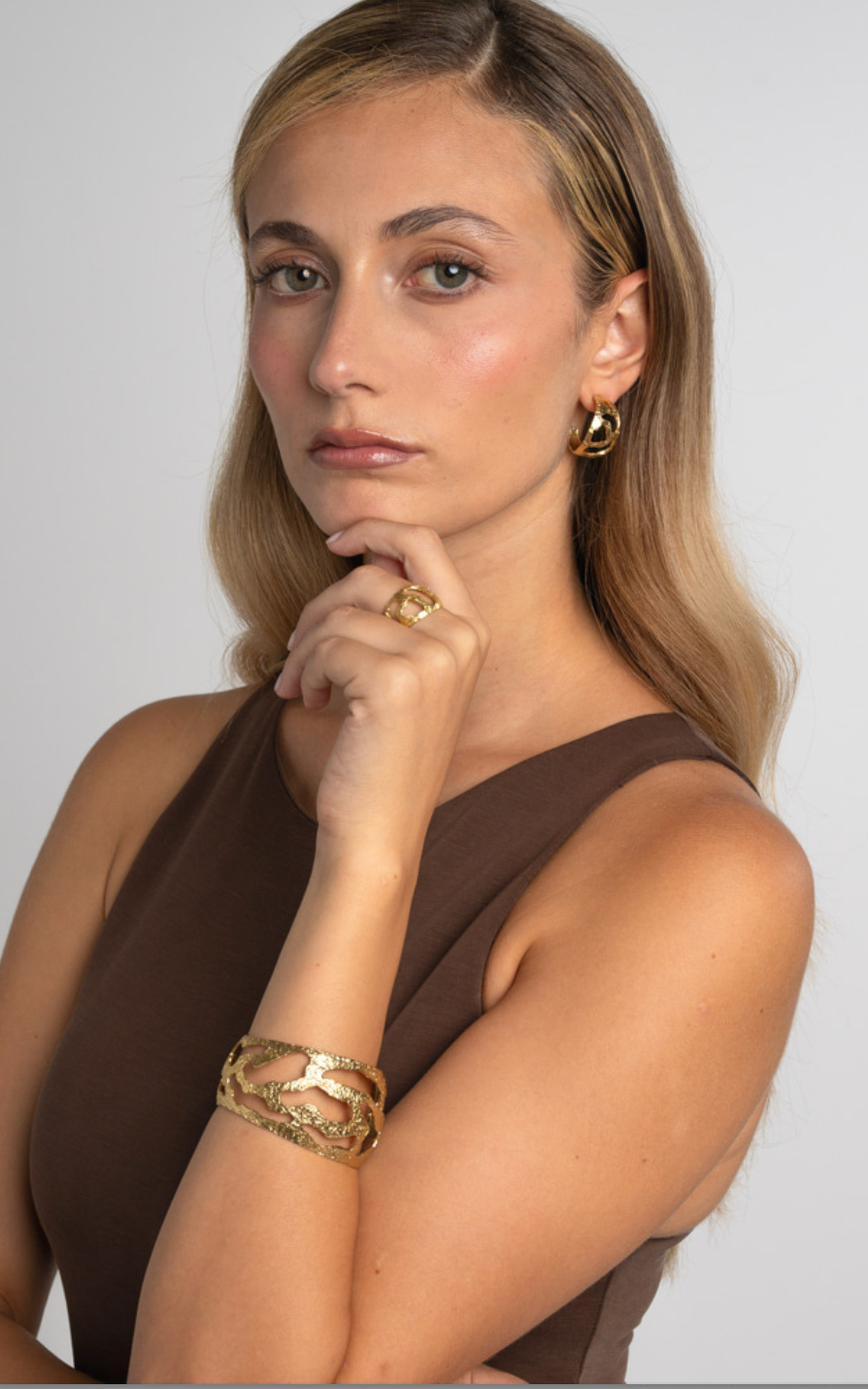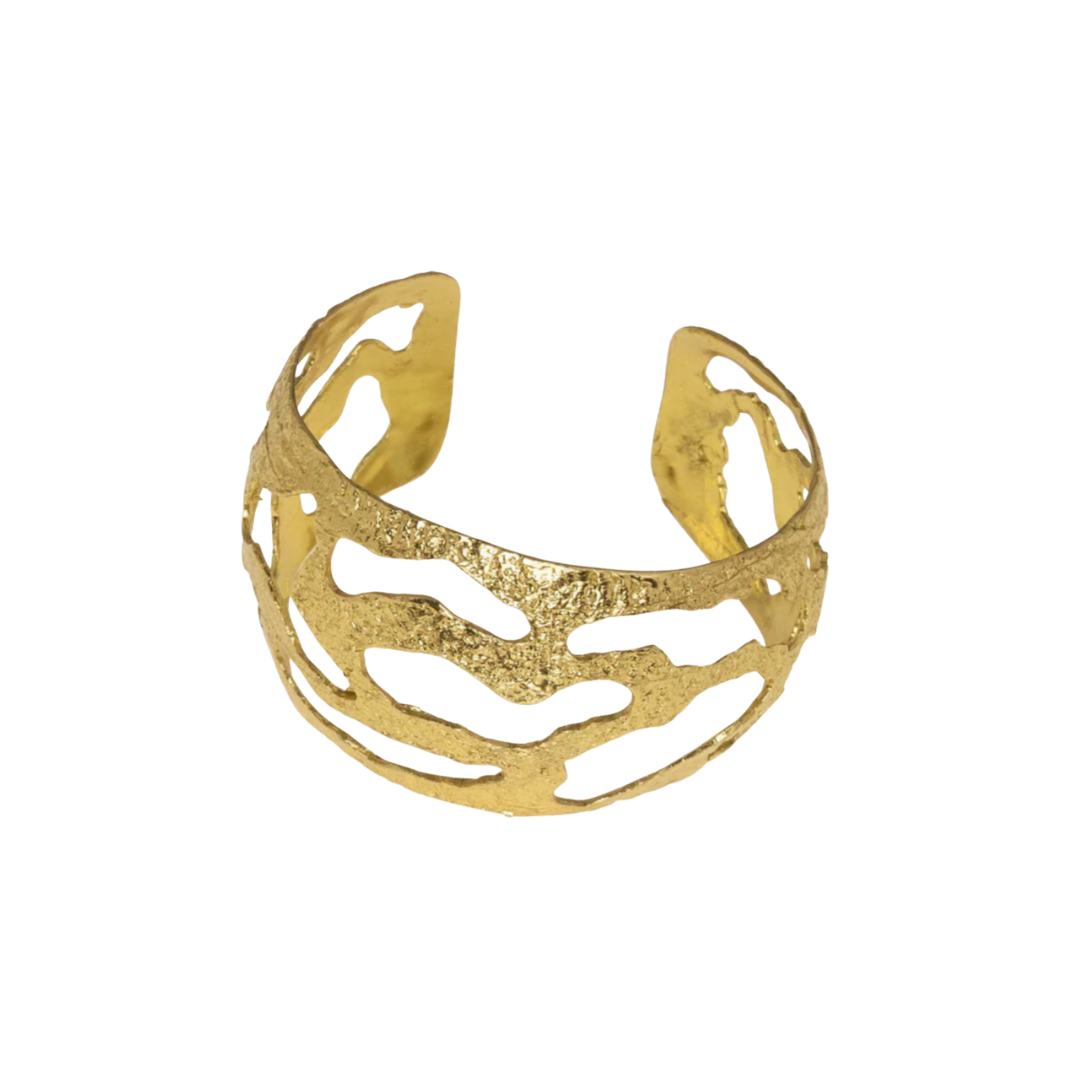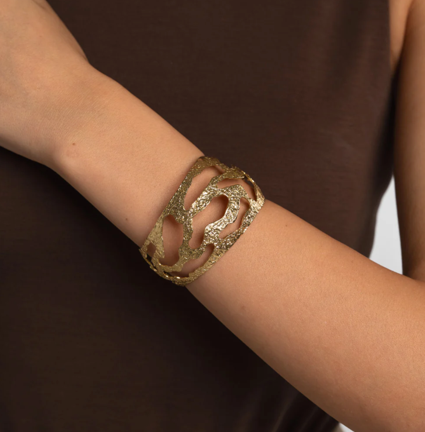 A sculptural bracelet inspired by organic forms, the Alara Bracelet blends bold texture with open, airy lines. Handcrafted in brass (hypoallergenic and nickel-free), it’s both striking and versatile — equally at home as a statement piece or layered with others.