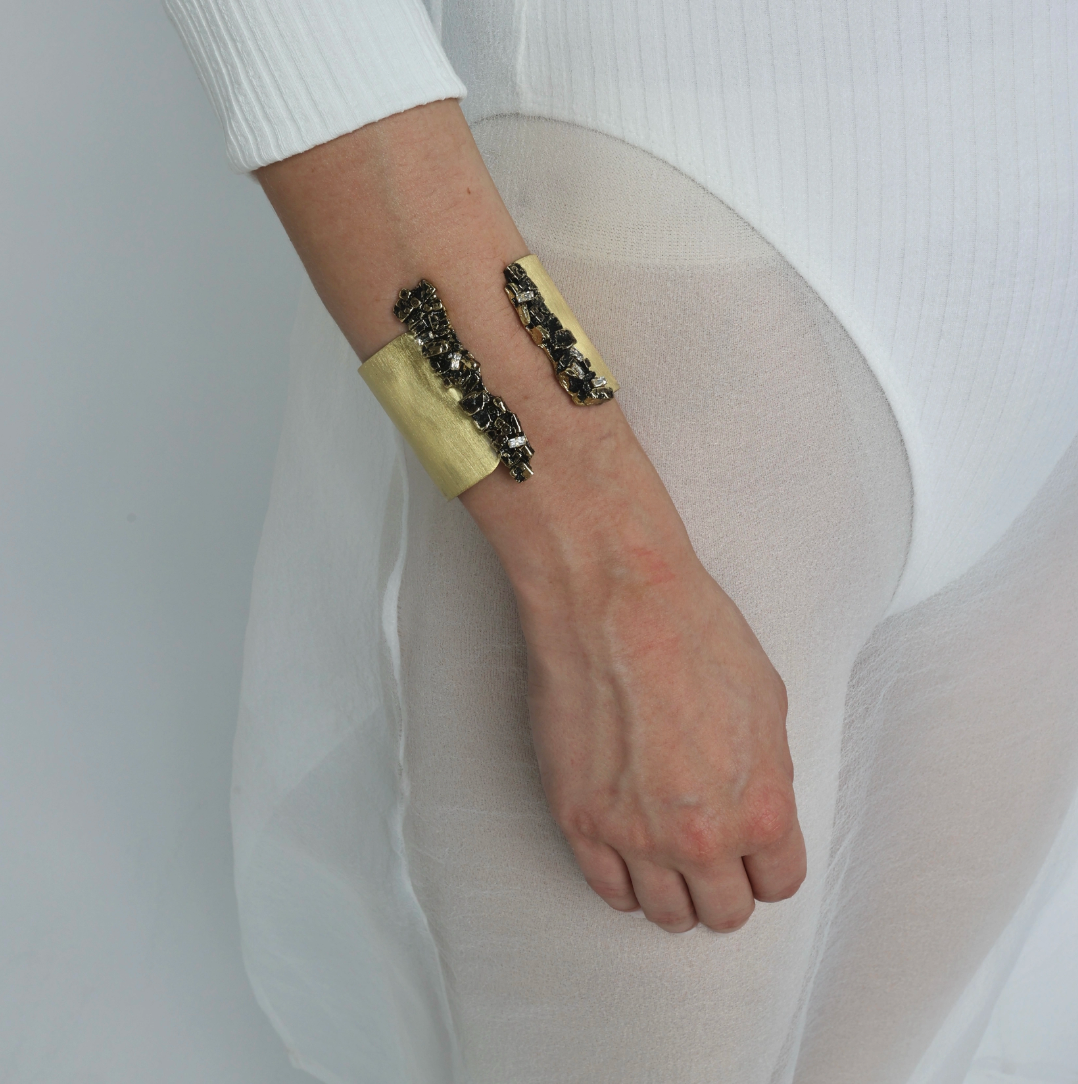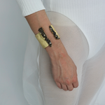 This bracelet is a wearable sculpture, a piece that doesn’t whisper but declares. Its asymmetry and open design embrace the wrist with strength, making it as much an object of art as of adornment. Each detail in the blackened patina tells a story of depth and resilience — an edge softened only by the golden warmth of brass.