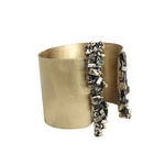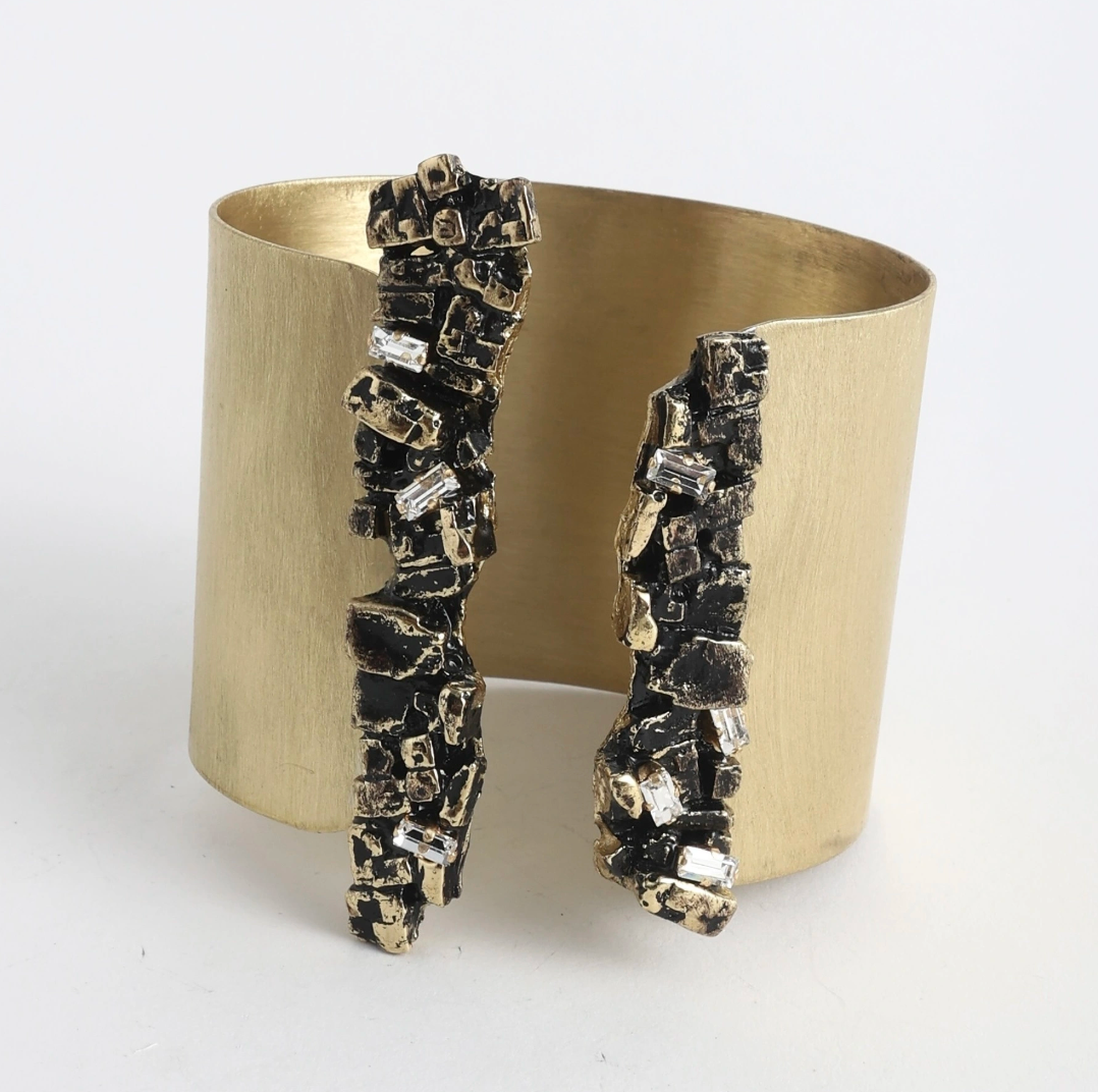 The Cassiane Cuff is power embodied in metal. Hand-crafted in brass, its form is split into two bold panels — one smooth, matte, and grounded, the other alive with rugged blackened textures that catch the light in fractured glints. The contrast between polished surface and raw oxidation creates a tension that feels both ancient and modern.