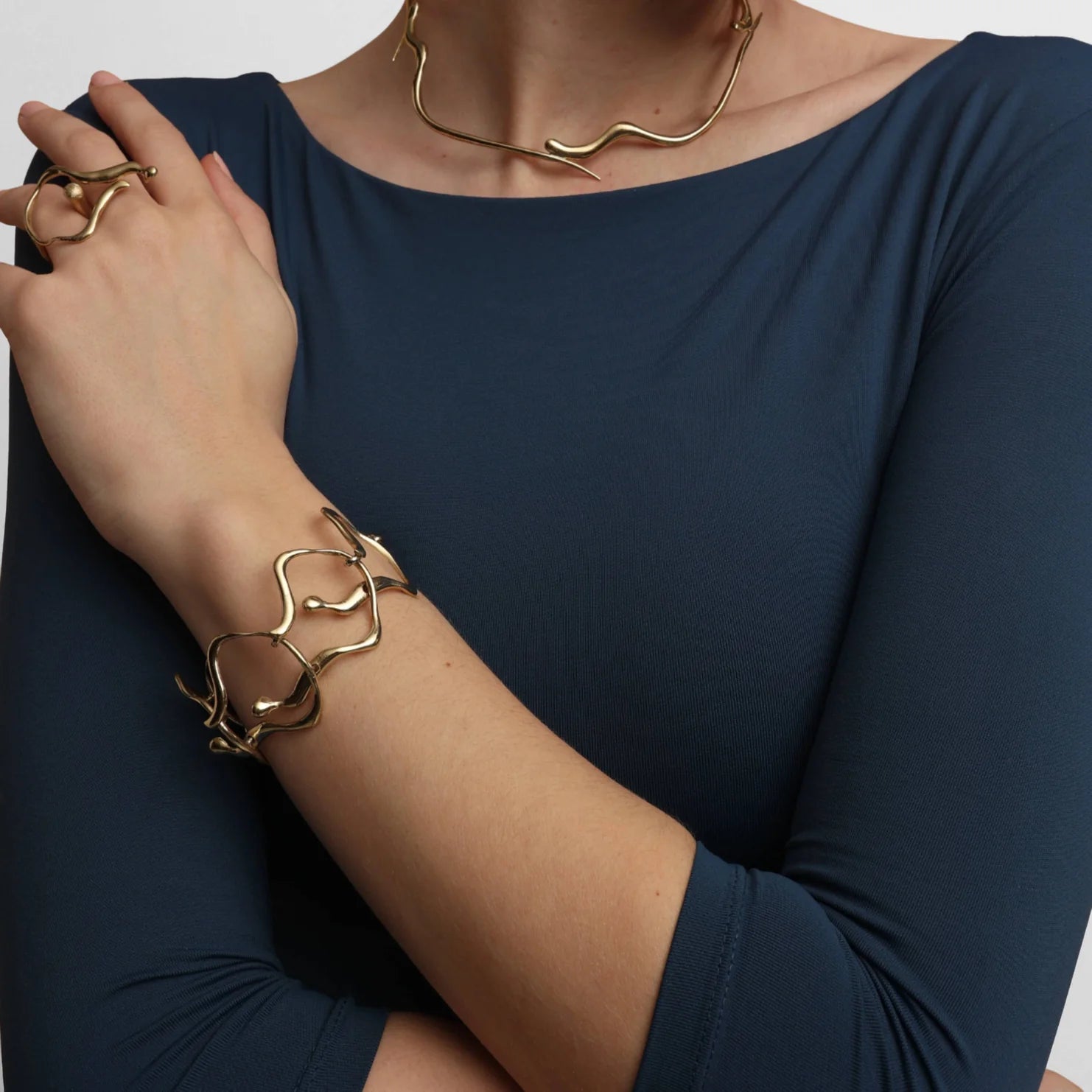 Minimal yet expressive, this ring is shaped by fluid lines that wrap gracefully around the finger. Its open, airy design makes it feel light and modern, while the polished curves add a touch of sculptural drama.