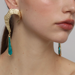Dramatic in form yet fluid in movement, the Sovana Earrings curve gracefully around the ear before dropping into a luminous aqua resin teardrop. The textured brass surface catches the light with every turn, while the resin’s watery depth adds a vibrant, modern edge.