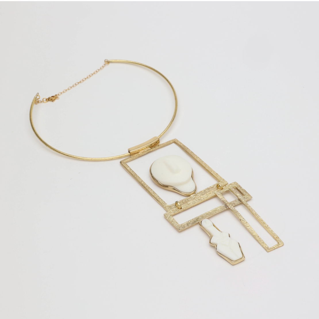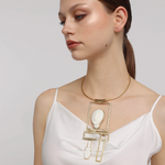 The Theia Face Choker is a commanding statement of wearable sculpture. Anchored by an abstract face within bold geometric frames, it draws from both ancient artistry and contemporary abstraction. Resting elegantly along the collarbone, it turns presence into poetry — a piece that carries both history and modern power.
