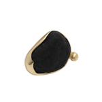 Raw yet refined, the Arra Ring distills modern artistry into a single, striking form. A smooth black resin stone rests within a molten brass frame, its asymmetry celebrating the beauty of imperfection and contrast.
