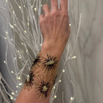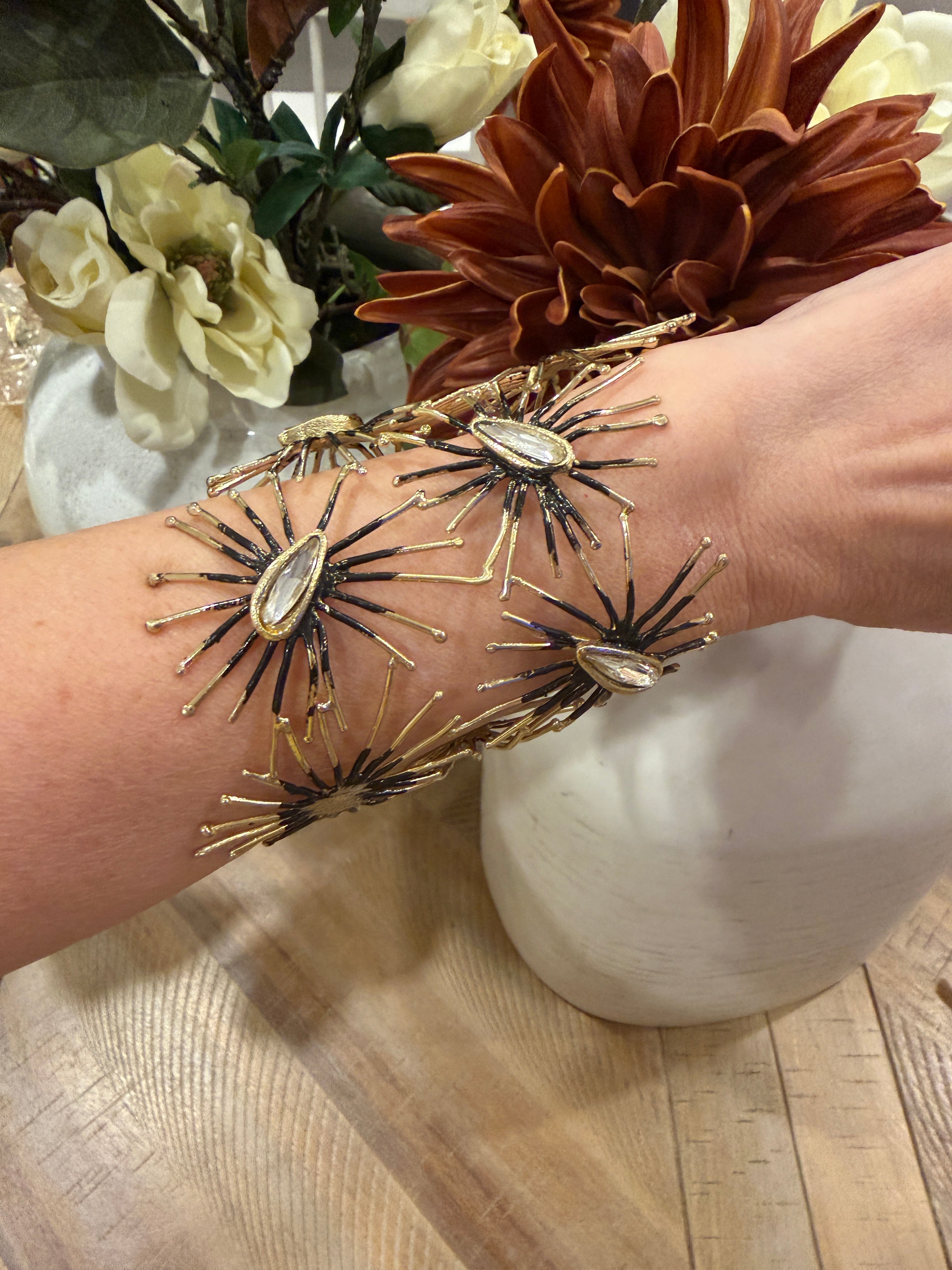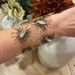 A bold nod to celestial elegance, the Marni Bracelet features a series of starburst motifs in brass, each centered by a dark teardrop crystal. Hypoallergenic, nickel-free, and crafted for long-lasting wear, it wraps the wrist in a radiant, modern silhouette.