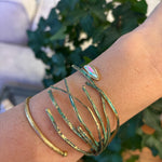 Sister to the India design, this sculptural cuff features slender brass branches finished with a subtle green oxidation. A single AB crystal shimmers at the open end, reflecting a kaleidoscope of color with every move. The adjustable, open design makes it easy to wear, while the textured finish adds an artful, modern touch.