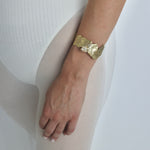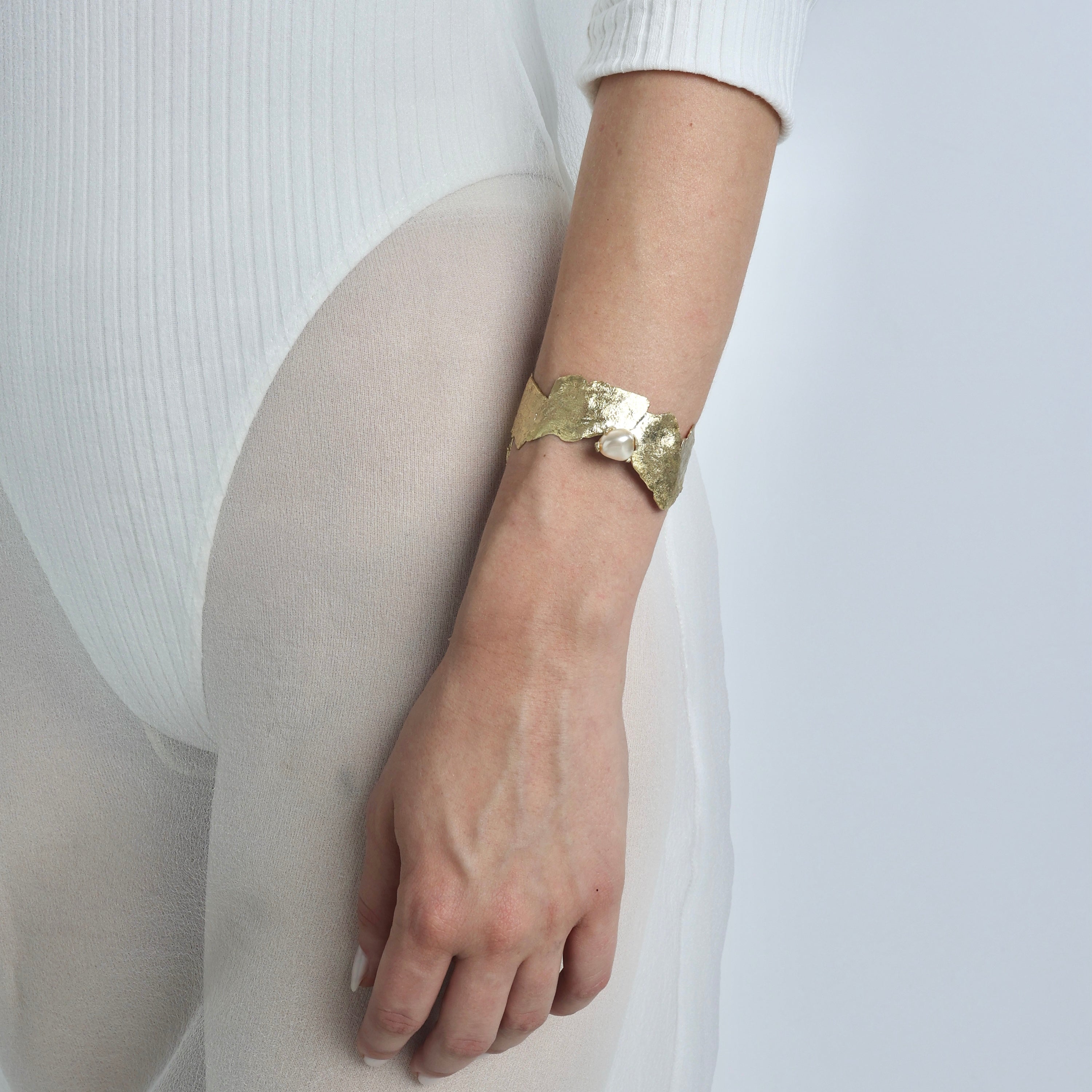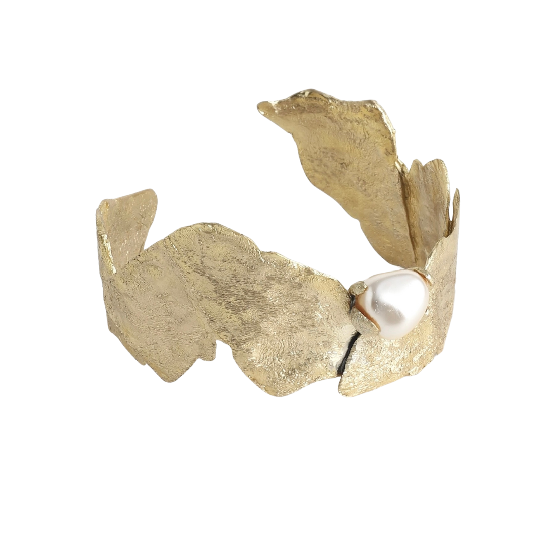 Minimalist in composition, but rich in texture and spirit. The Elli Pearl Bracelet features a gently sculpted cuff of golden brass, shaped like torn parchment or windswept leaves. At its heart sits a single baroque pearl—raw, luminous, and entirely unique. It's a quiet kind of elegance, full of strength and softness, like nature’s own signature.
