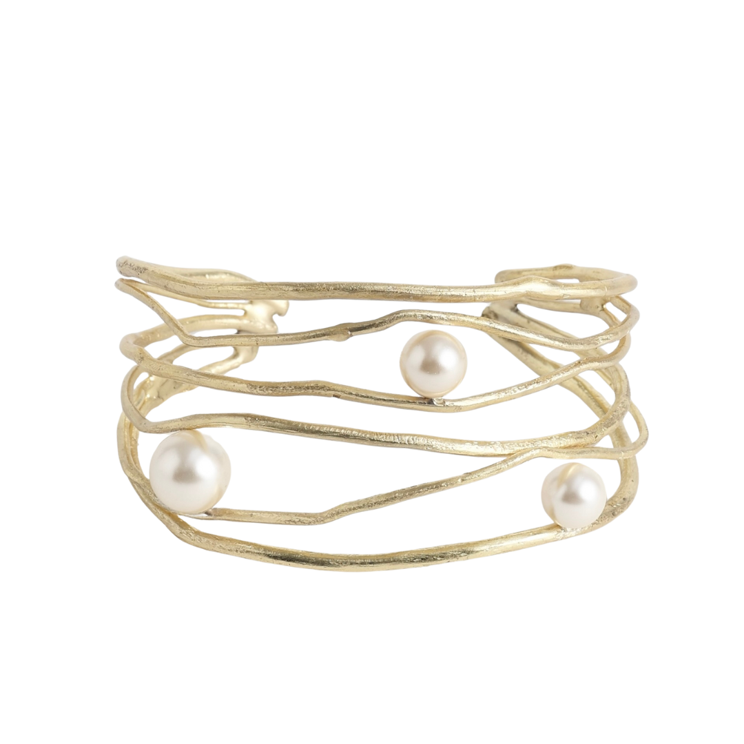 Graceful, untamed, and full of movement—the Yvette Pearl Bracelet wraps the wrist in delicate, winding lines of hand-textured brass. Scattered among the open layers are luminous freshwater pearls, like drops of morning dew caught in golden branches. Light yet sculptural, Yvette feels like a breath of air—effortlessly elegant, quietly radiant.