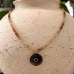 At its center rests a bold smoky topaz pendant, framed in 18k gold-plated sterling silver, with a single amethyst stone set at its heart — a quiet spark of violet that adds depth and contrast.