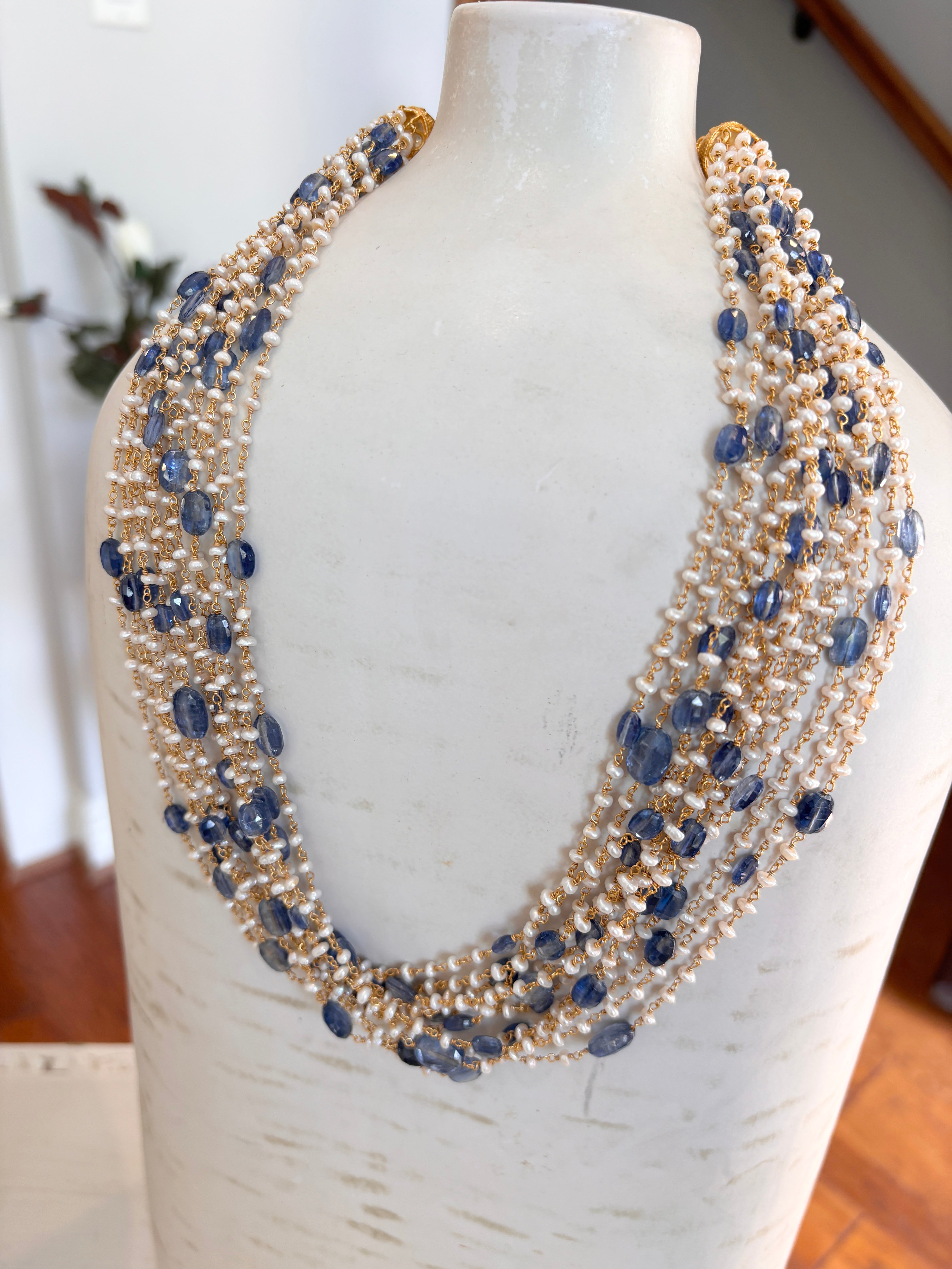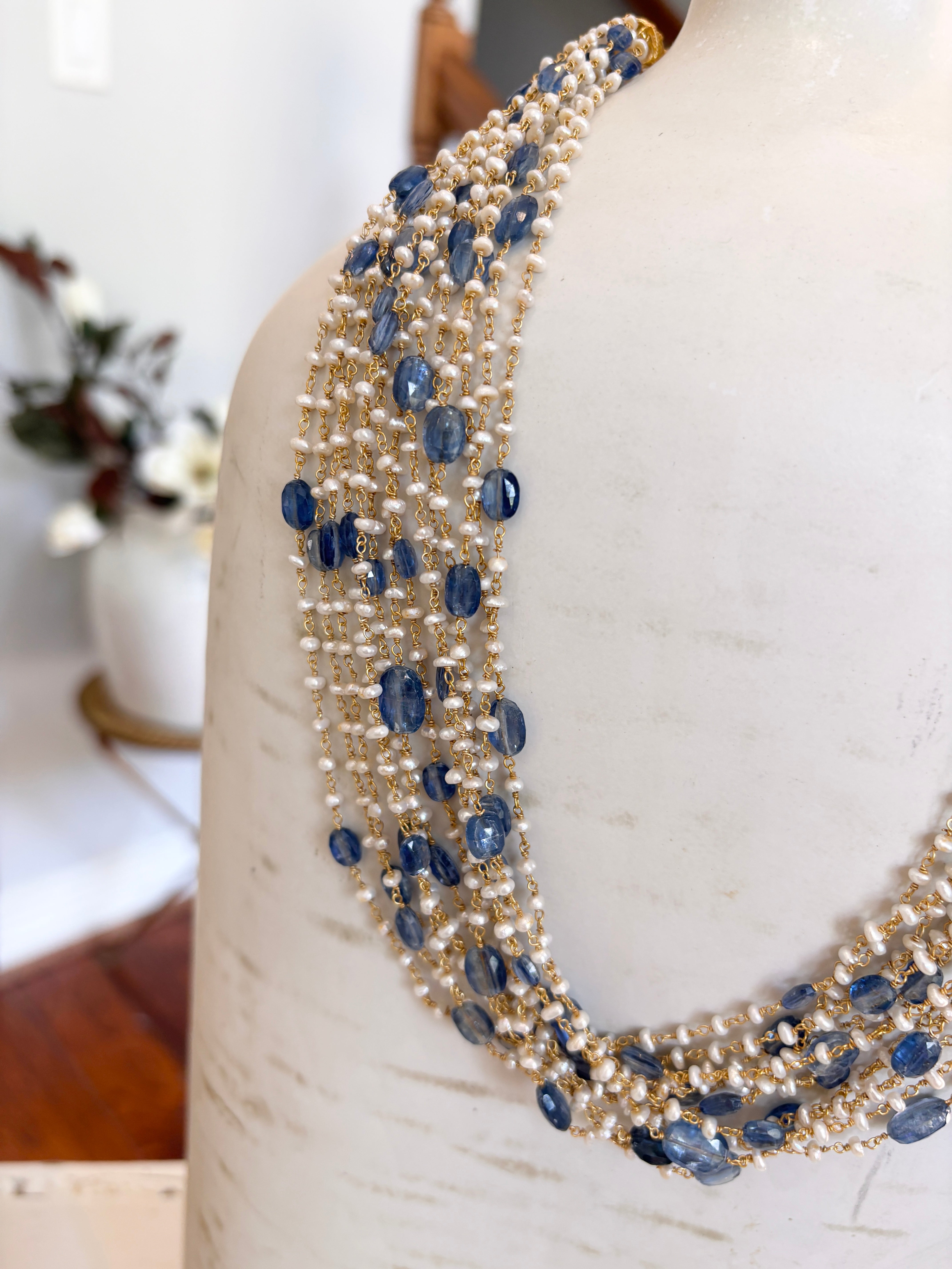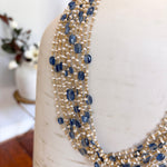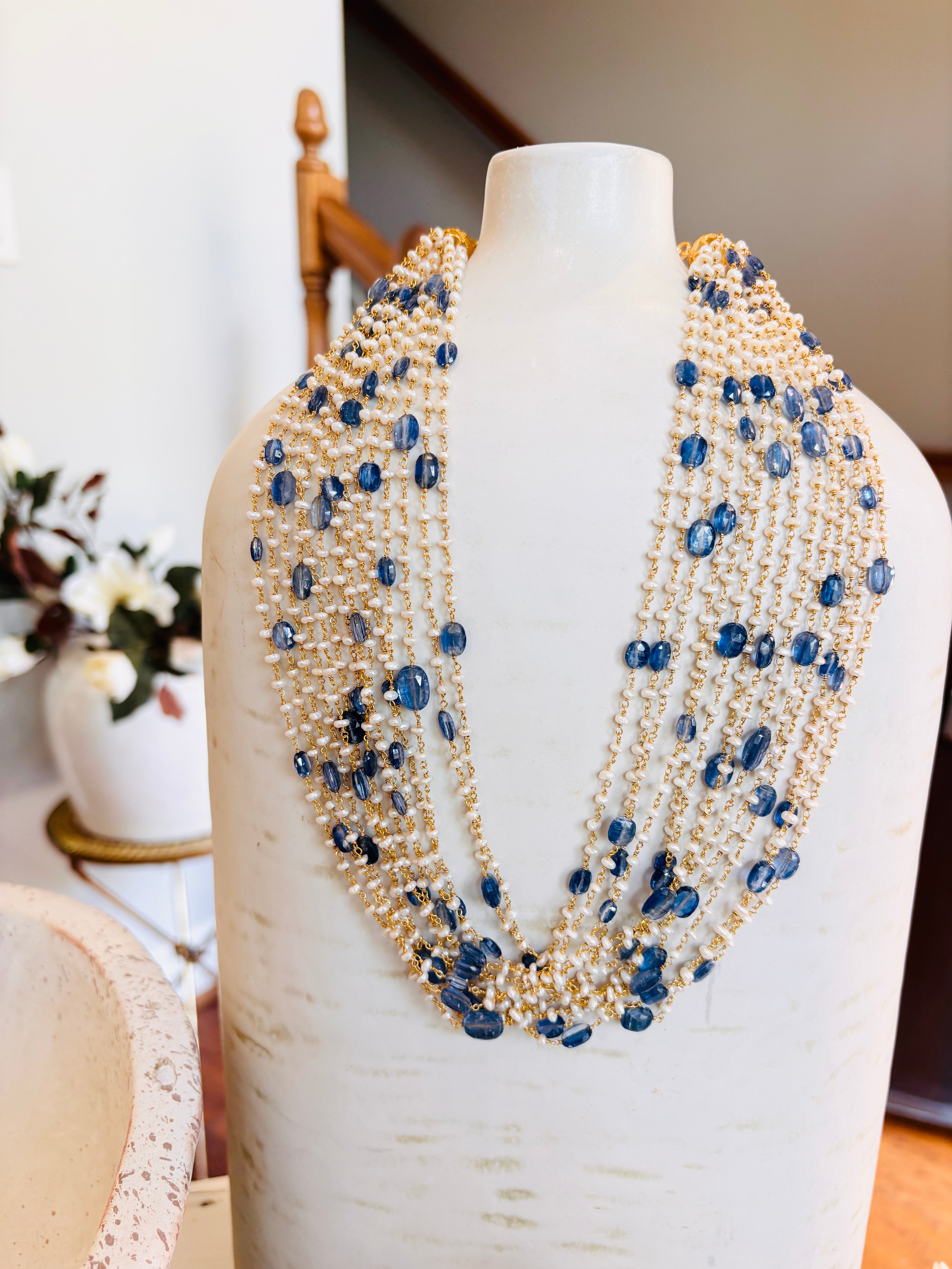 Make a statement the moment you enter the room with our Barbara Necklace. This captivating piece features delicate, tiny pearls hand-knotted onto a sterling silver chain plated in 18K gold. Intermixed with a multitude of mesmerizing Kyanite stones, it exudes both timeless elegance and a modern edge. The necklace is fully adjustable, with a maximum length of 45 cm (16 inches) thanks to its chain extension—designed to perfectly complement any neckline.