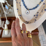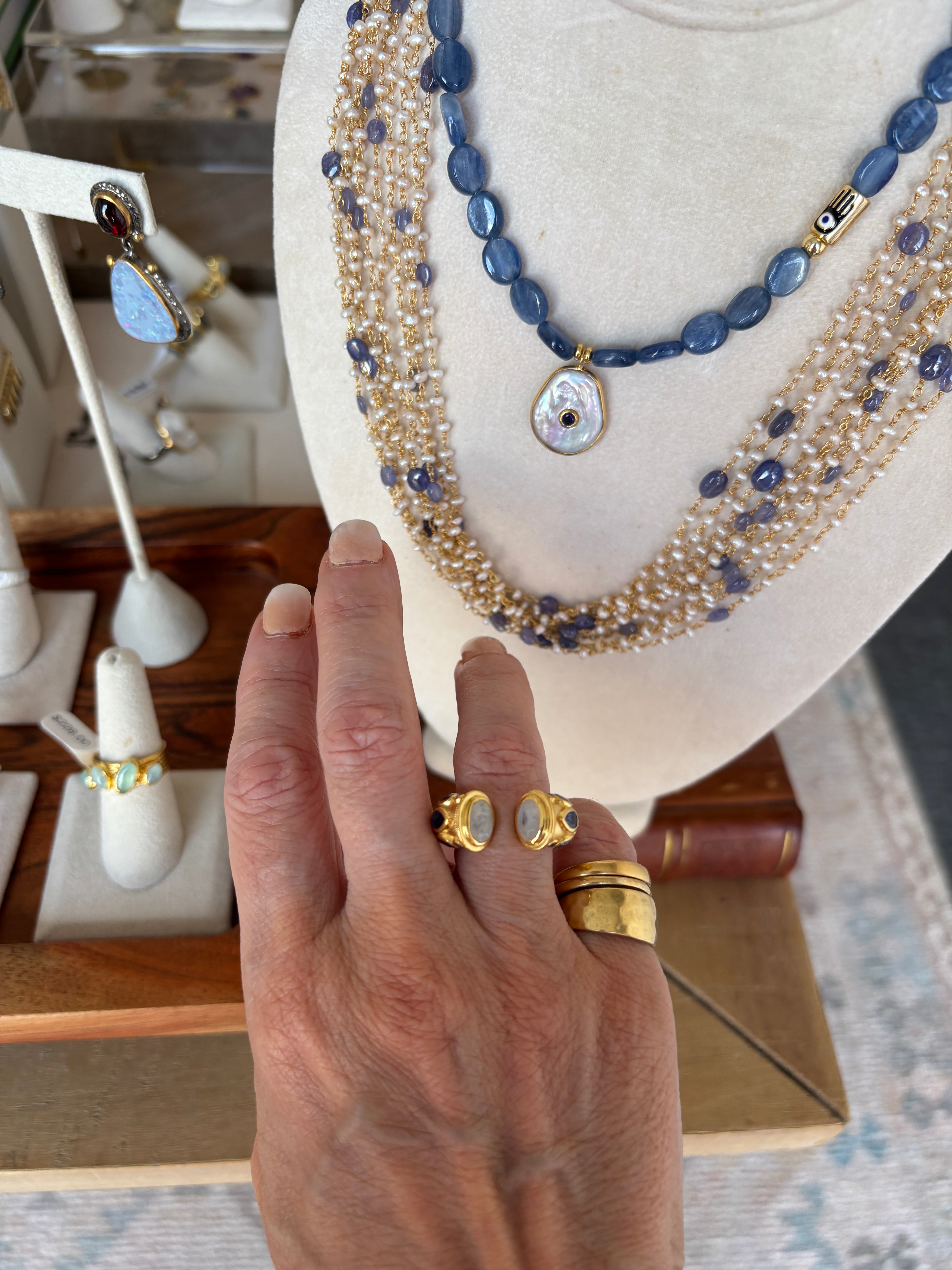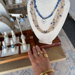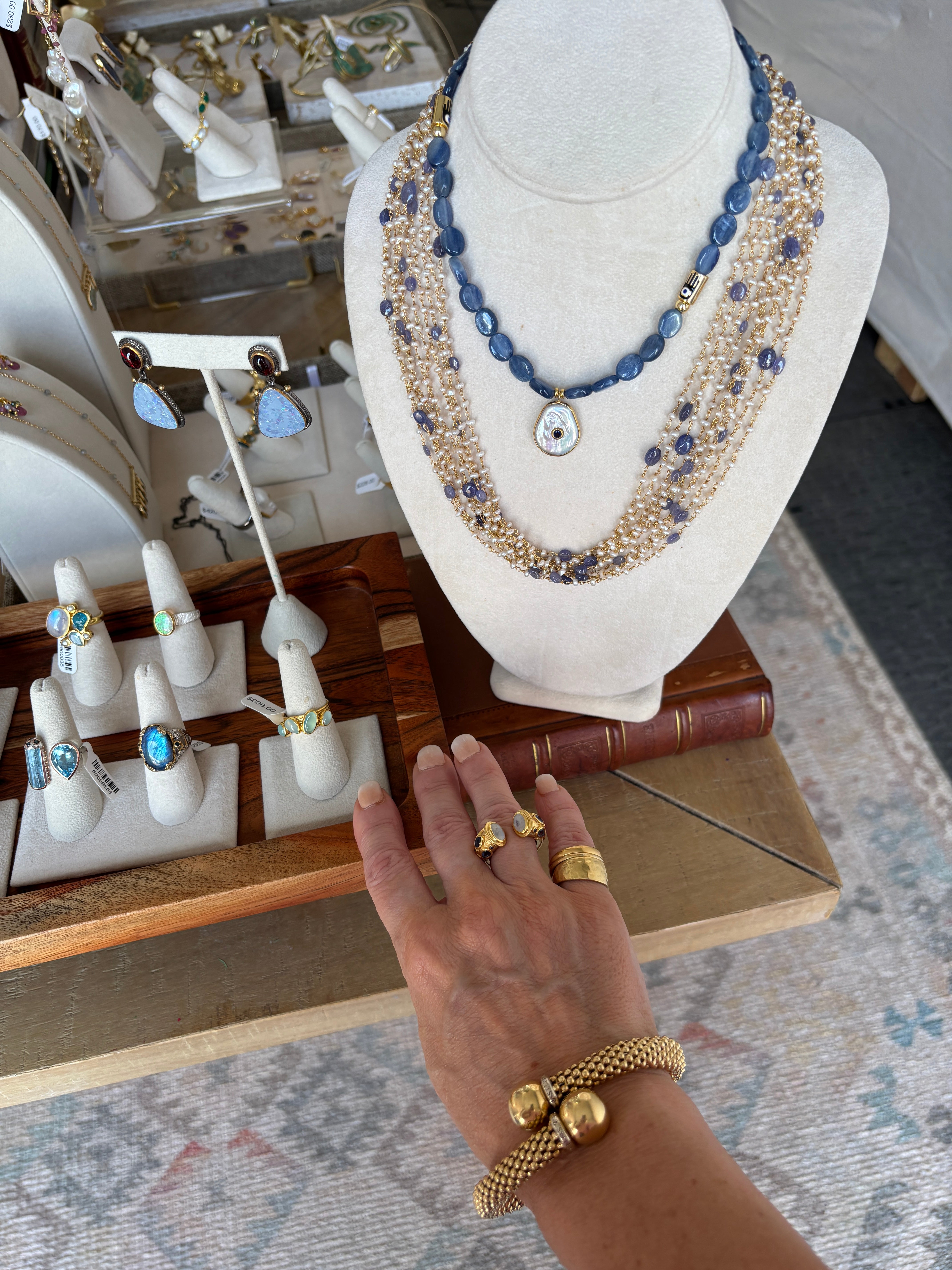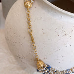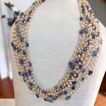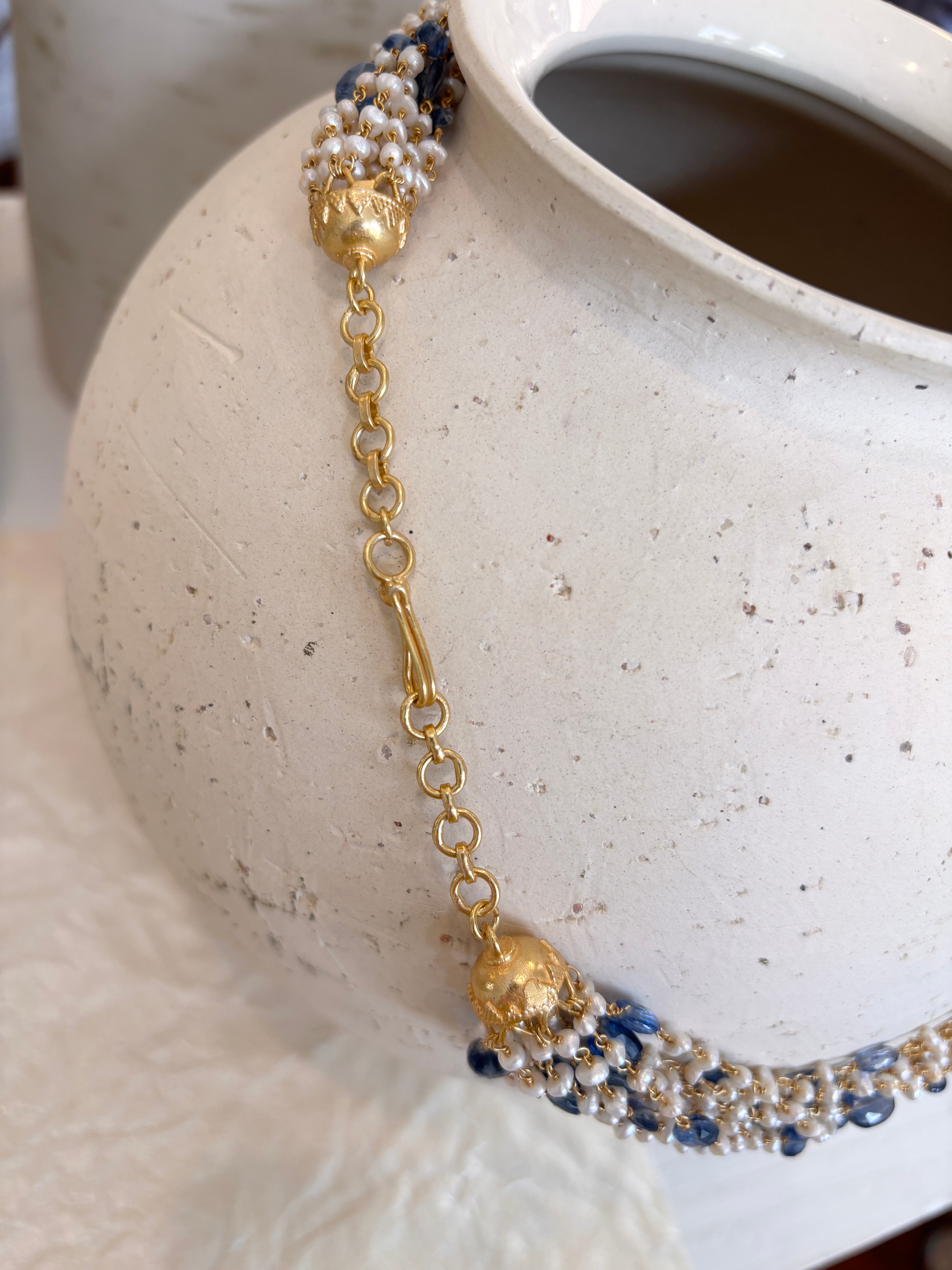 Make a statement the moment you enter the room with our Barbara Necklace. This captivating piece features delicate, tiny pearls hand-knotted onto a sterling silver chain plated in 18K gold. Intermixed with a multitude of mesmerizing Kyanite stones, it exudes both timeless elegance and a modern edge. The necklace is fully adjustable, with a maximum length of 45 cm (16 inches) thanks to its chain extension—designed to perfectly complement any neckline.
