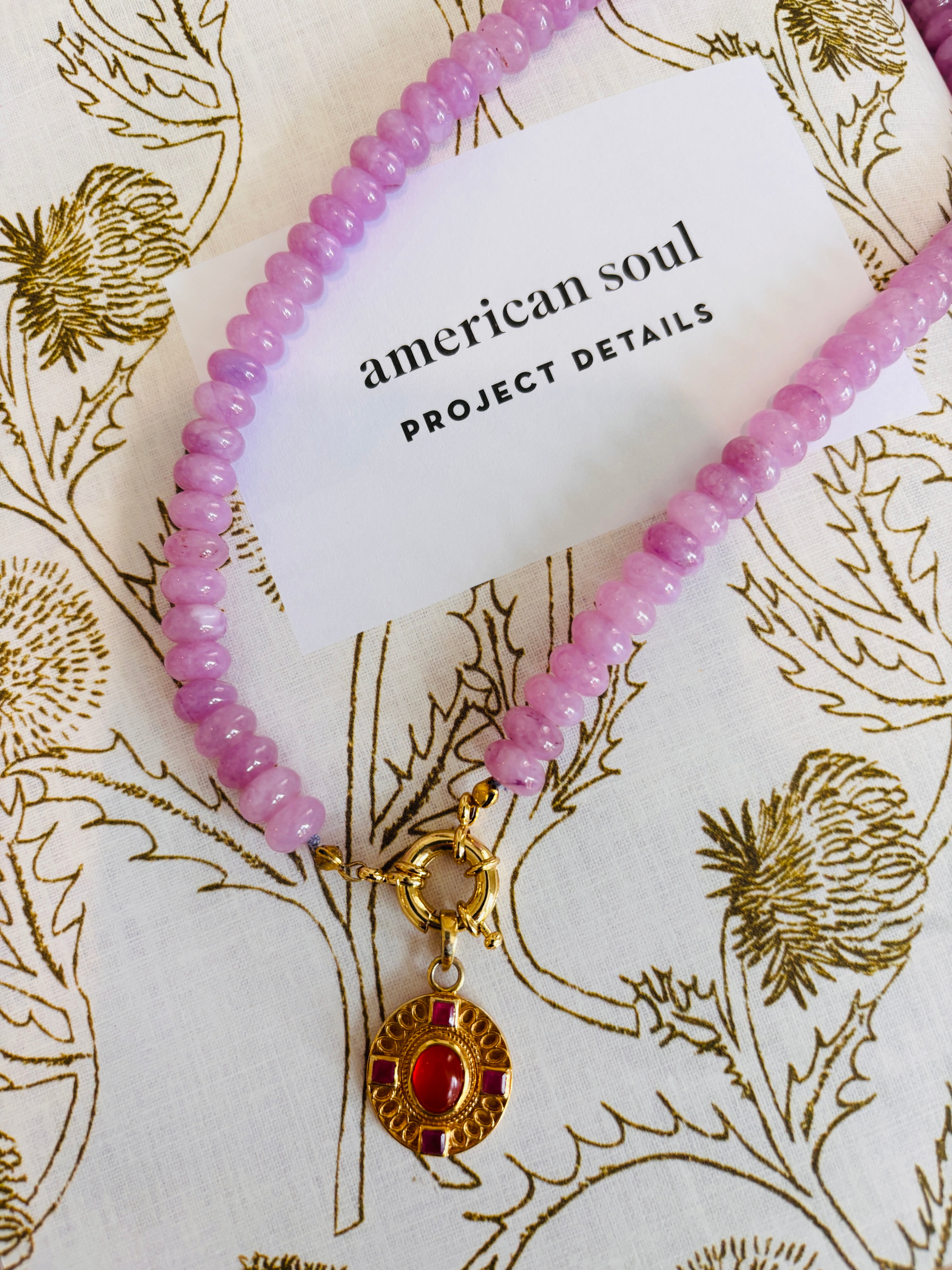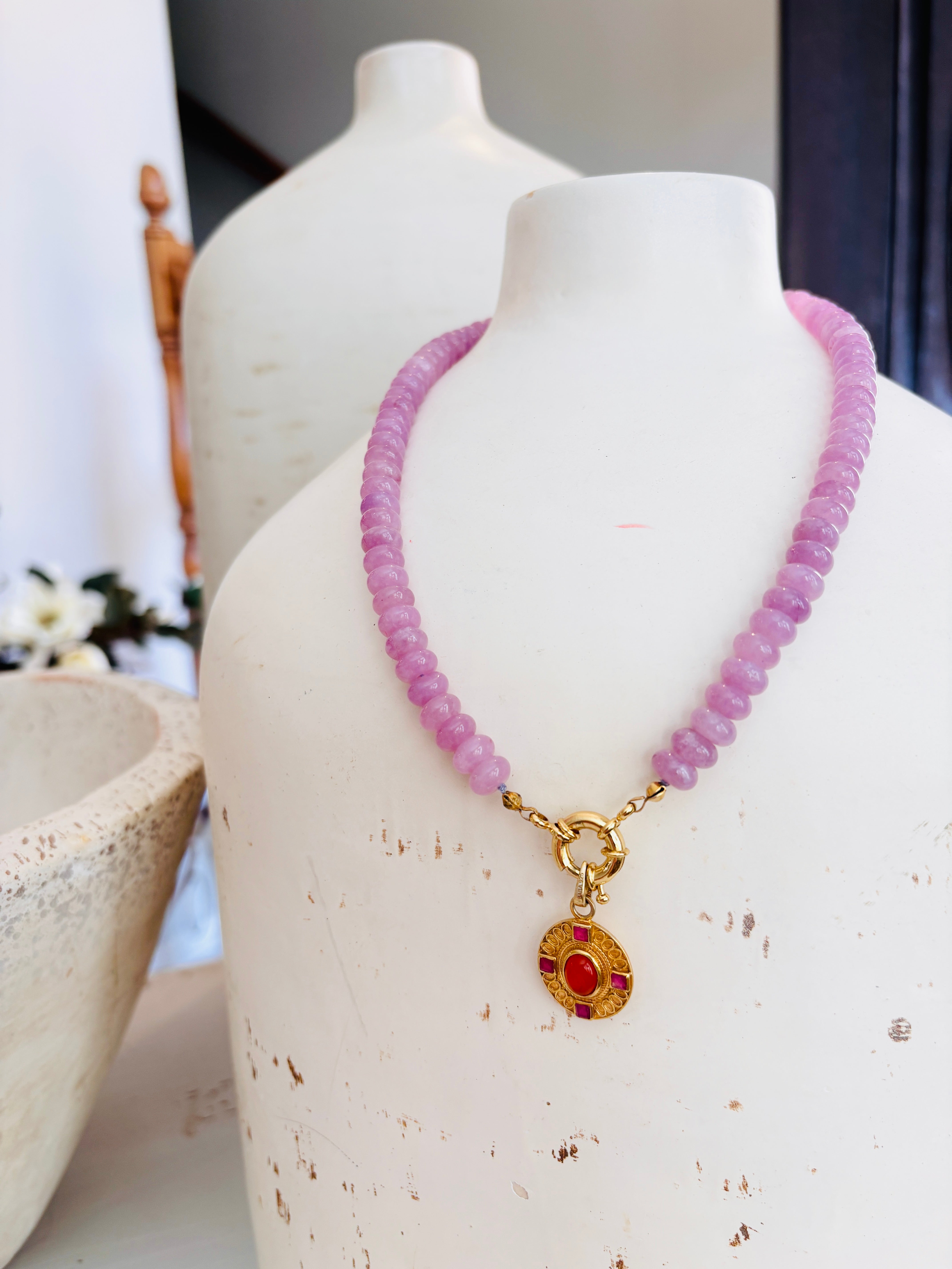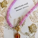 Pink Jade Necklace — bold elegance meets artisan craftsmanship in this vibrant piece. Handmade in our Houston studio, it features natural silk accented with rich pink jade beads and a luminous 18K gold-filled sailor key. A striking pendant crafted from sterling silver plated in luxurious 24K gold showcases a vivid carnelian centerpiece surrounded by four sparkling rubies.