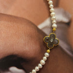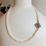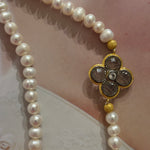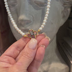 This modern necklace features delicate 6 mm freshwater pearls paired with an off-center pendant that evokes a blooming flower. The pendant is a faceted spinel crowned by a luminous mini white sapphire, framed by oxidized silver with a contrasting gold margin. Crafted in gold vermeil over sterling silver, the 16" chain with extension rests beautifully at the base of the neck or layers effortlessly with your favorite pieces.