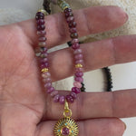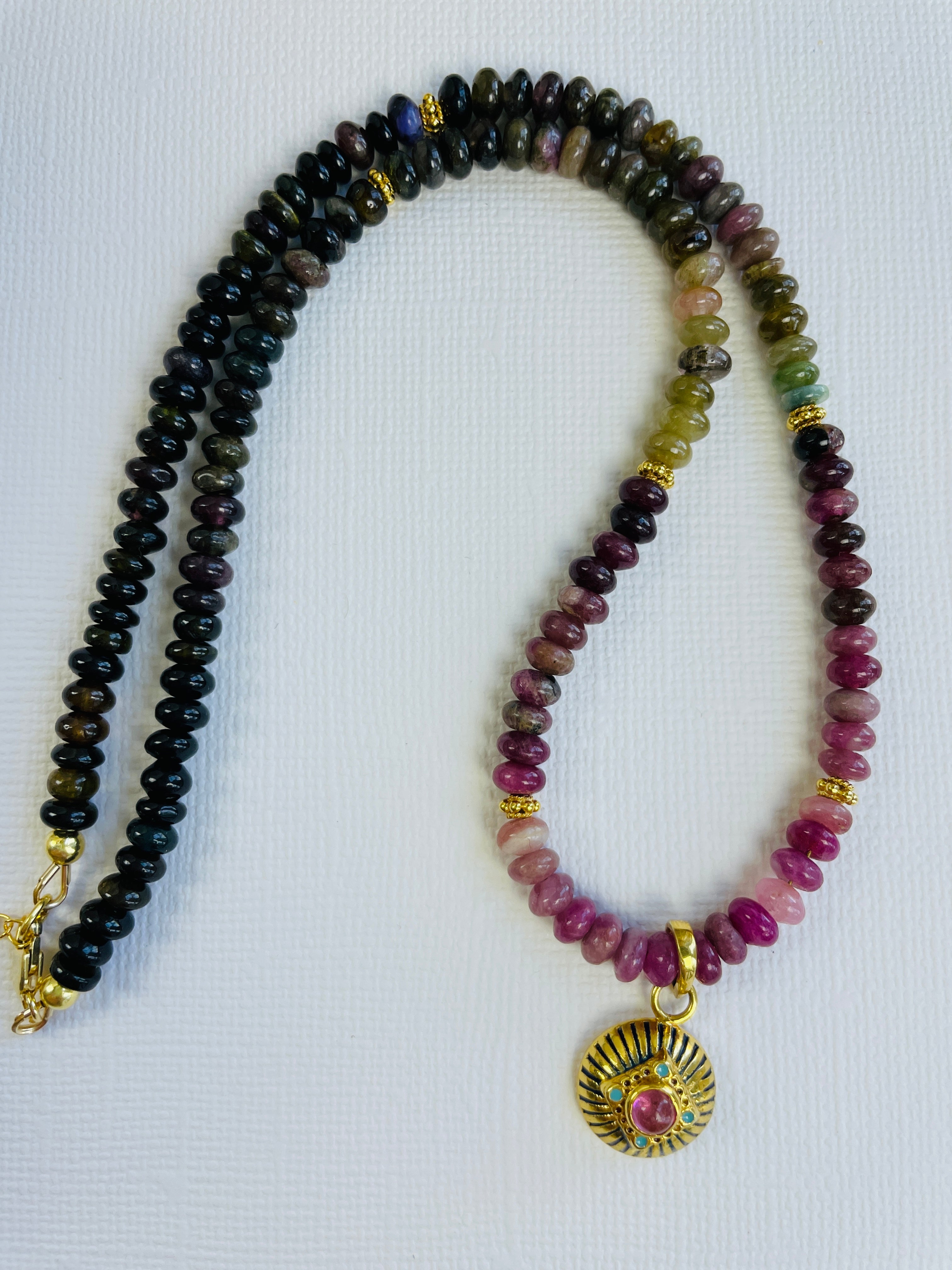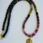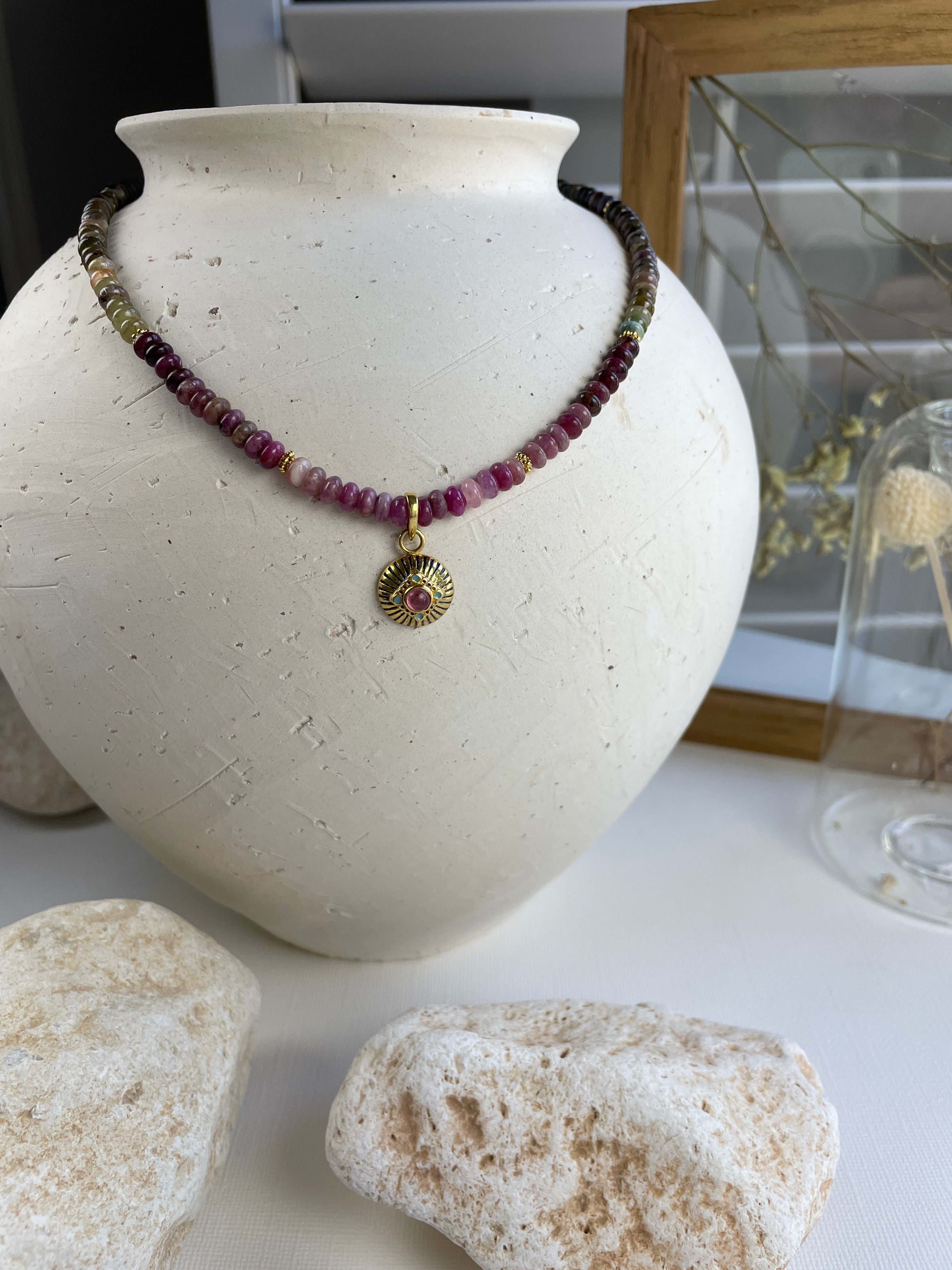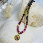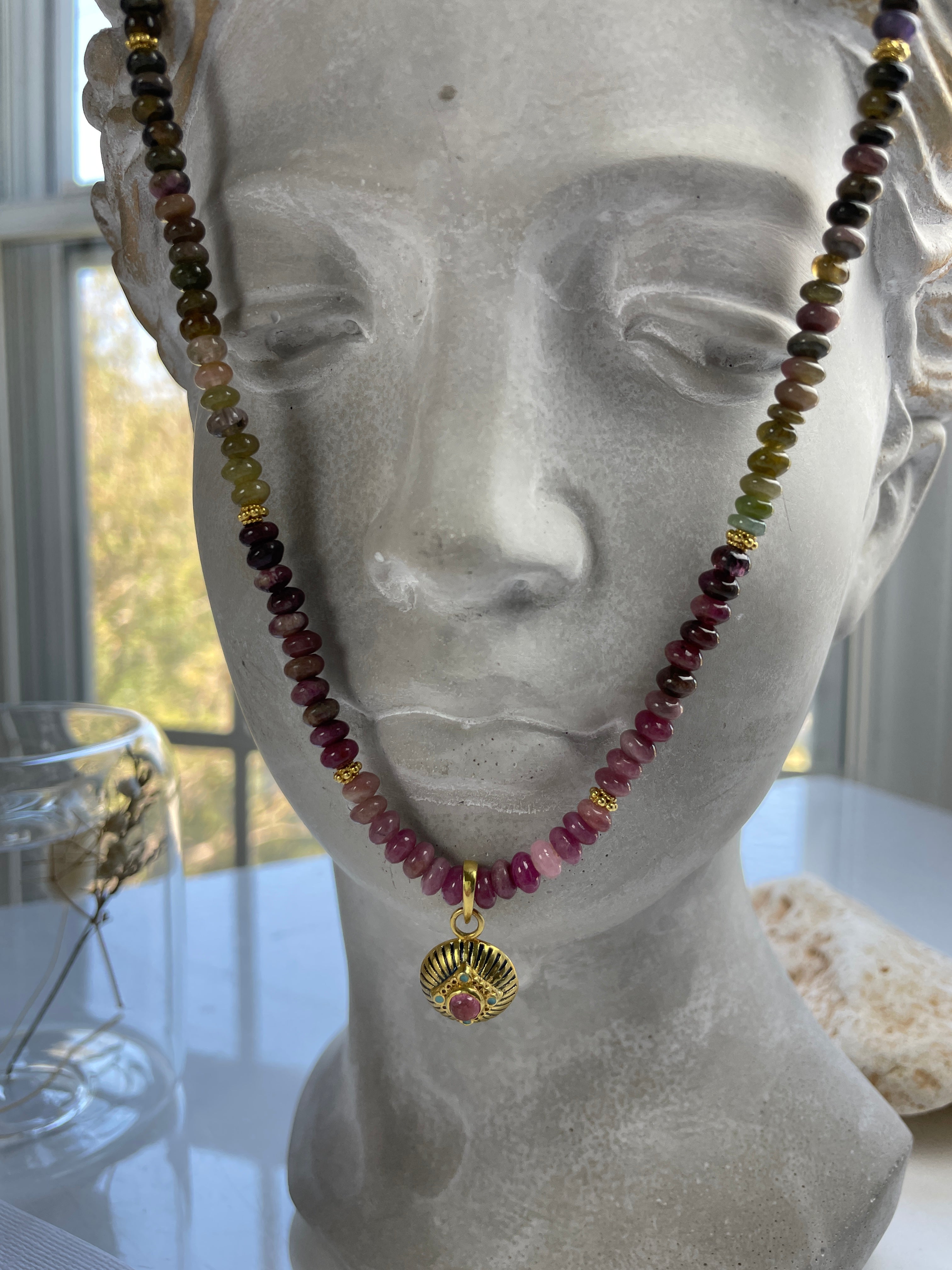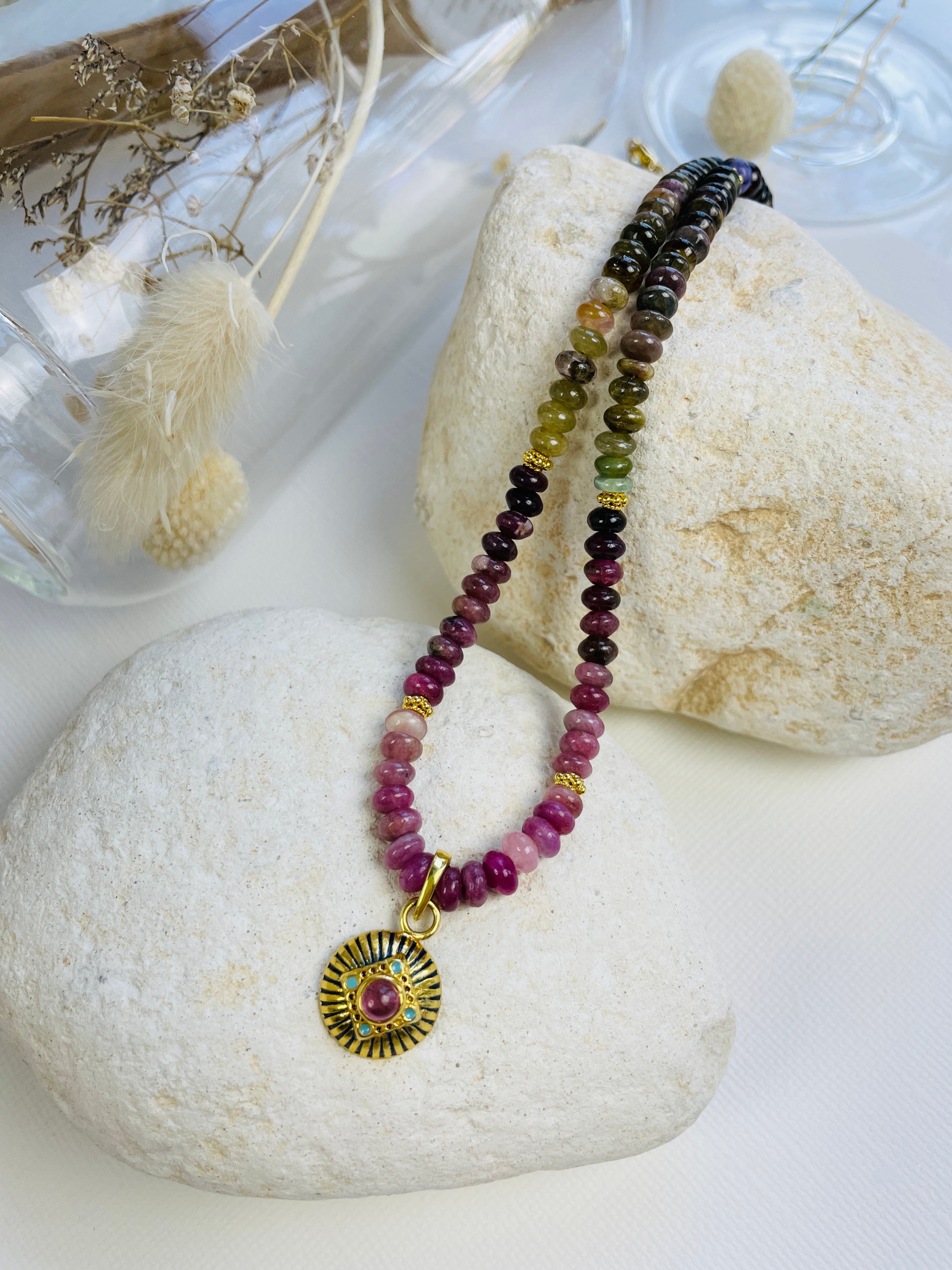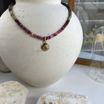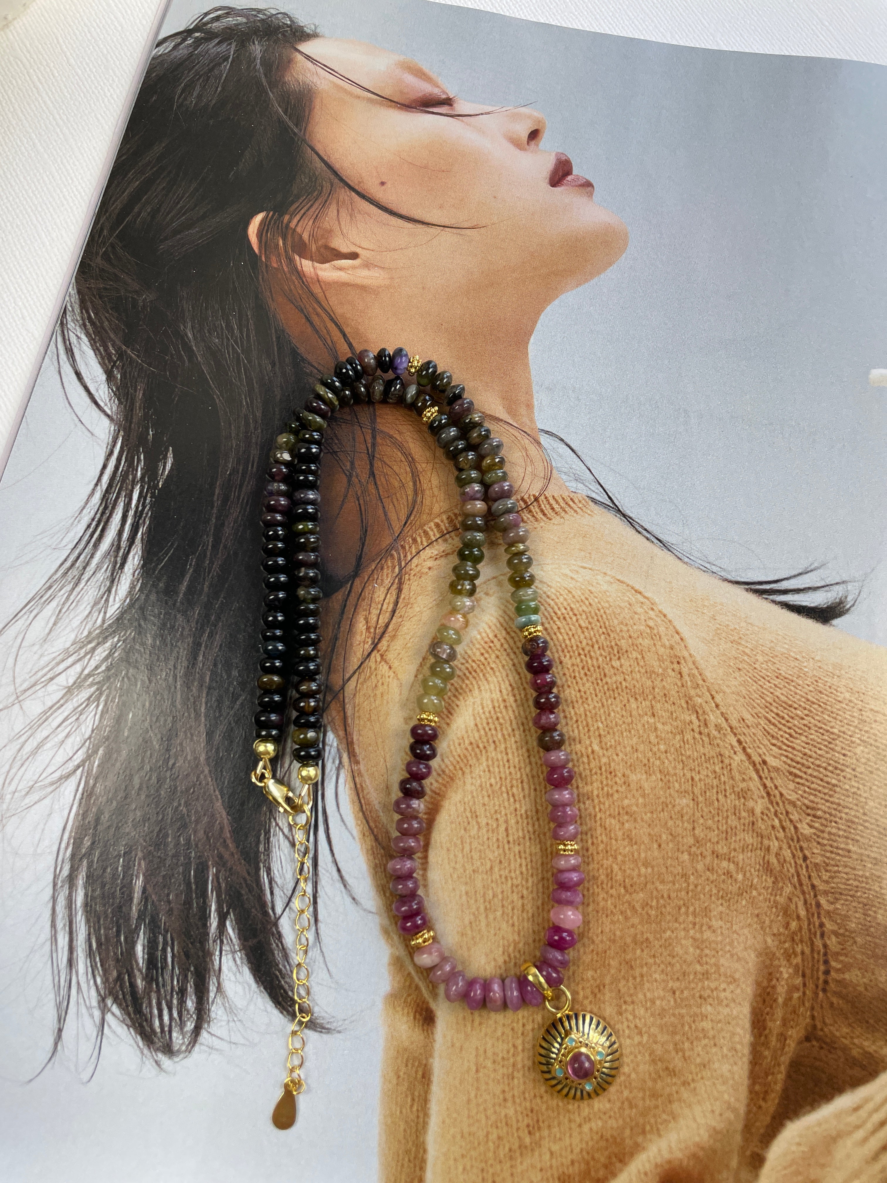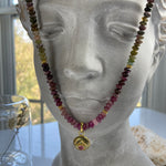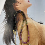 Introducing our exquisite Scarlett Signature Necklace from the captivating Baba's Edit Collection. Each piece is a unique design, meticulously handmade using natural tourmaline stones and 24K gold vermeil spacers and key. The necklace is designed to be worn at a shorter length, offering a hint of versatility with the 2" chain extension.