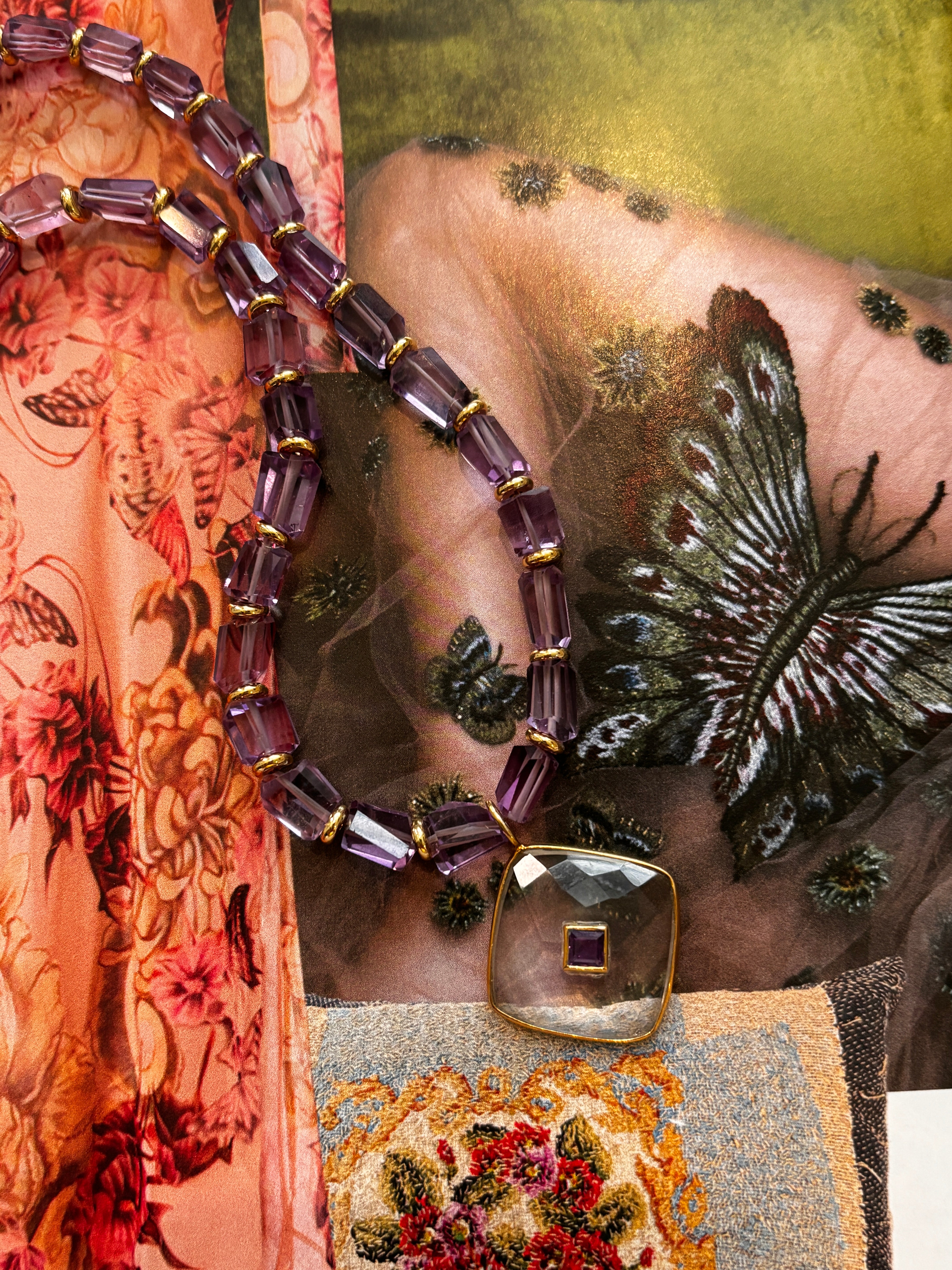 At the center rests an 18K gold-plated charm, set with a square-cut amethyst that catches the light with every movement — a refined focal point that feels both classic and modern.