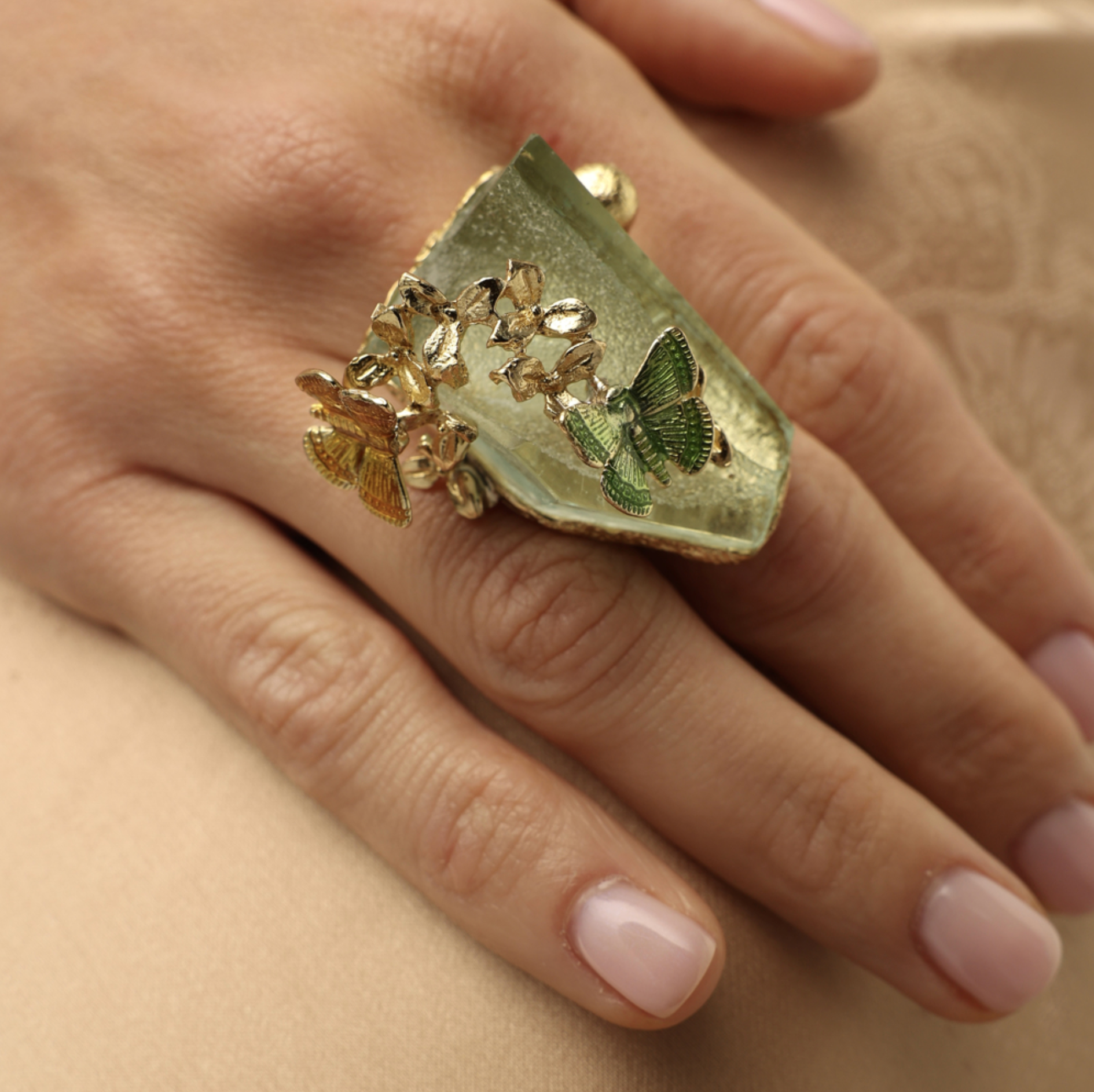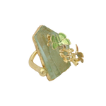 This sculptural ring captures the quiet magic of a garden moment. A translucent soft green stone forms the base of the design, reminiscent of moss-covered glass or dew resting on leaves at dawn.