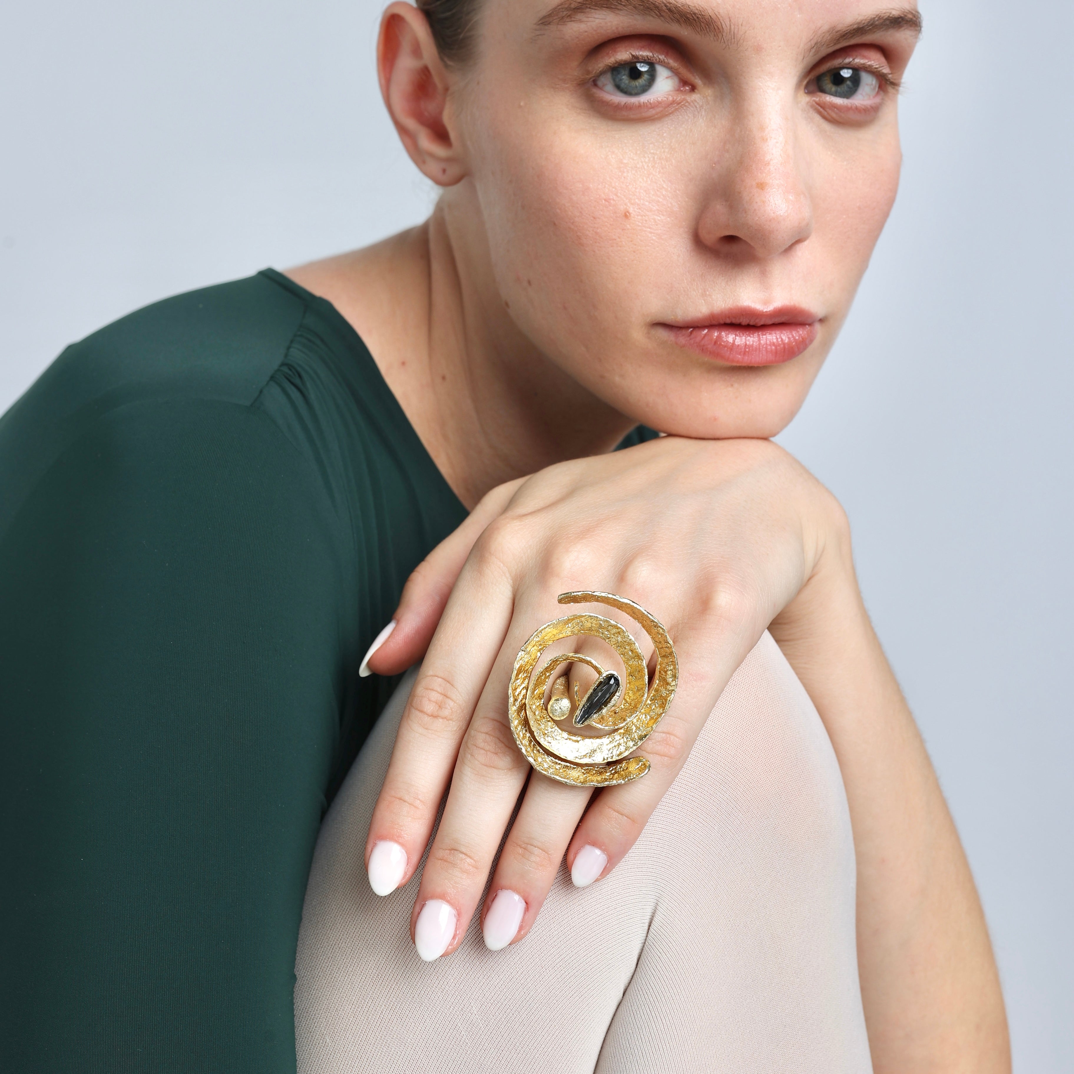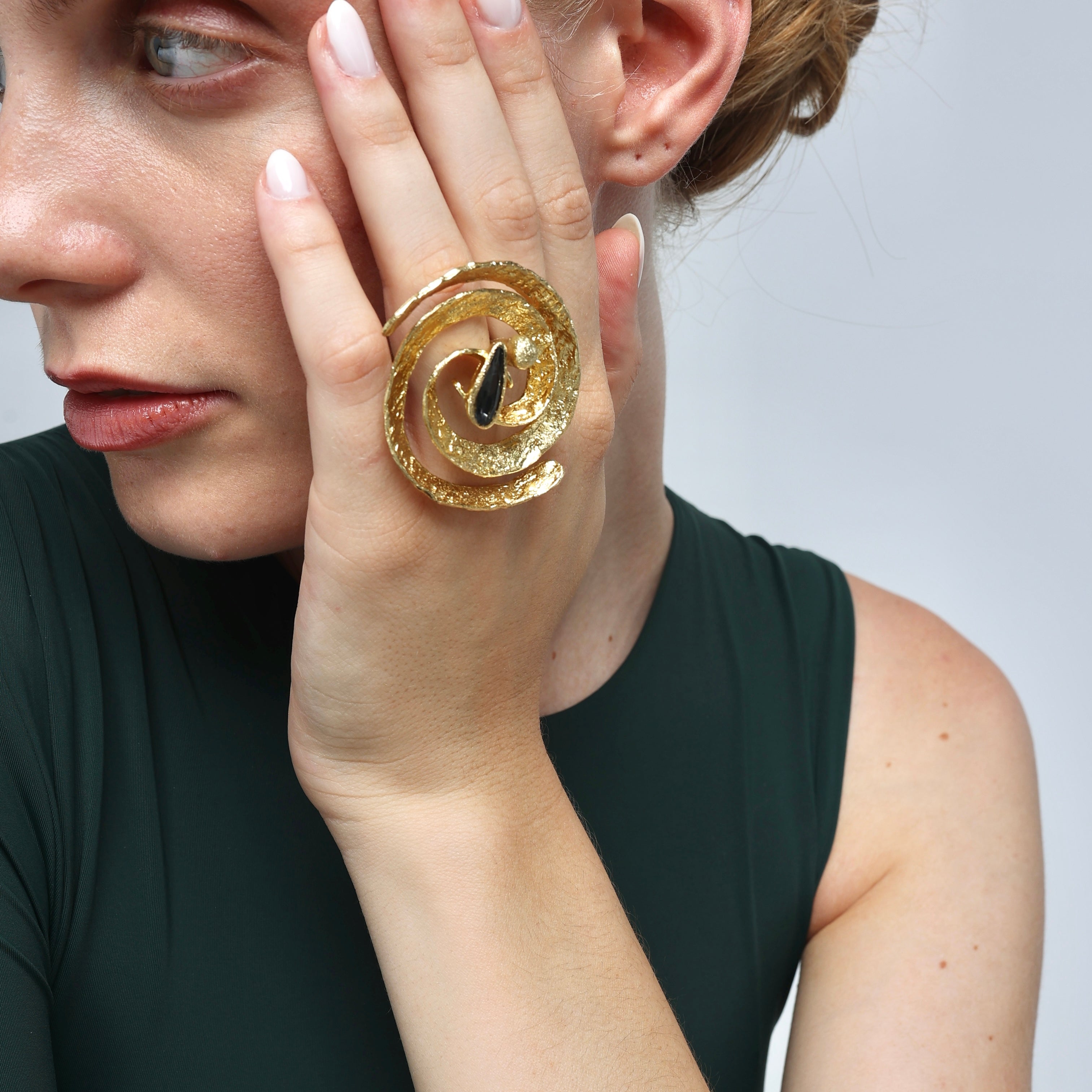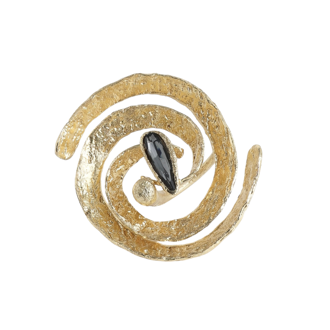 Dramatic and artful, the Chantal Spiral Ring features bold brass coils that form a hypnotic swirl around a dark, teardrop crystal. Hypoallergenic, nickel-free, and designed for lasting wear, it’s a show-stopping piece that merges modern sculpture with statement-making flair.