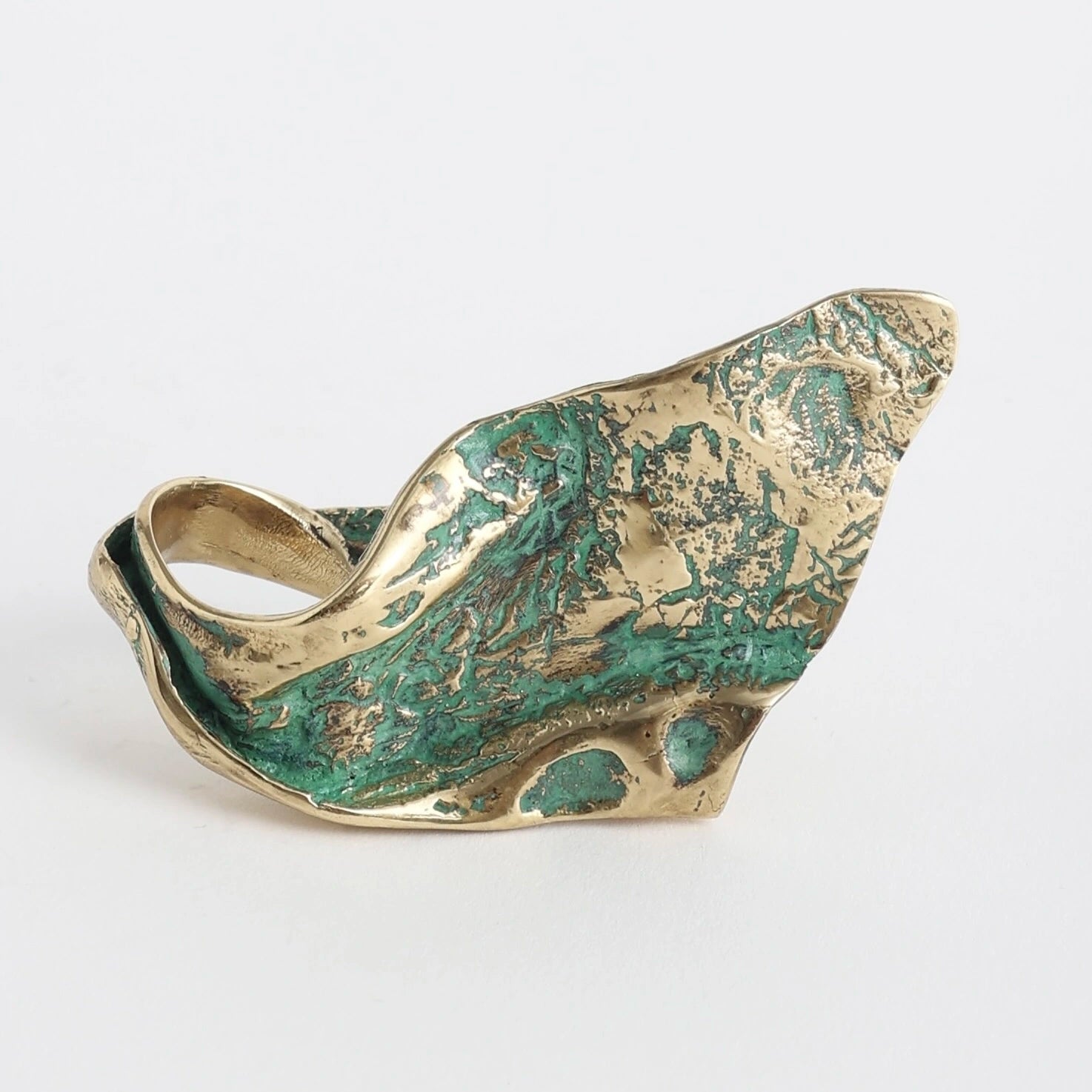 A testament to nature’s fluid beauty, the Evora Crest Ring features a sculptural brass form highlighted by green oxidation. Its open, adjustable design ensures a comfortable fit, while the hypoallergenic, nickel-free construction offers enduring wear. A modern statement piece for those who appreciate artful, organic silhouettes.