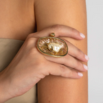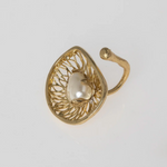 The essence of the collection distilled into one striking accent. A single baroque pearl rests within a filigree-like brass frame, echoing the textures of the bracelet and choker. Sculptural yet versatile, the ring is a statement on its own, or a perfect complement to the larger Solenne pieces.