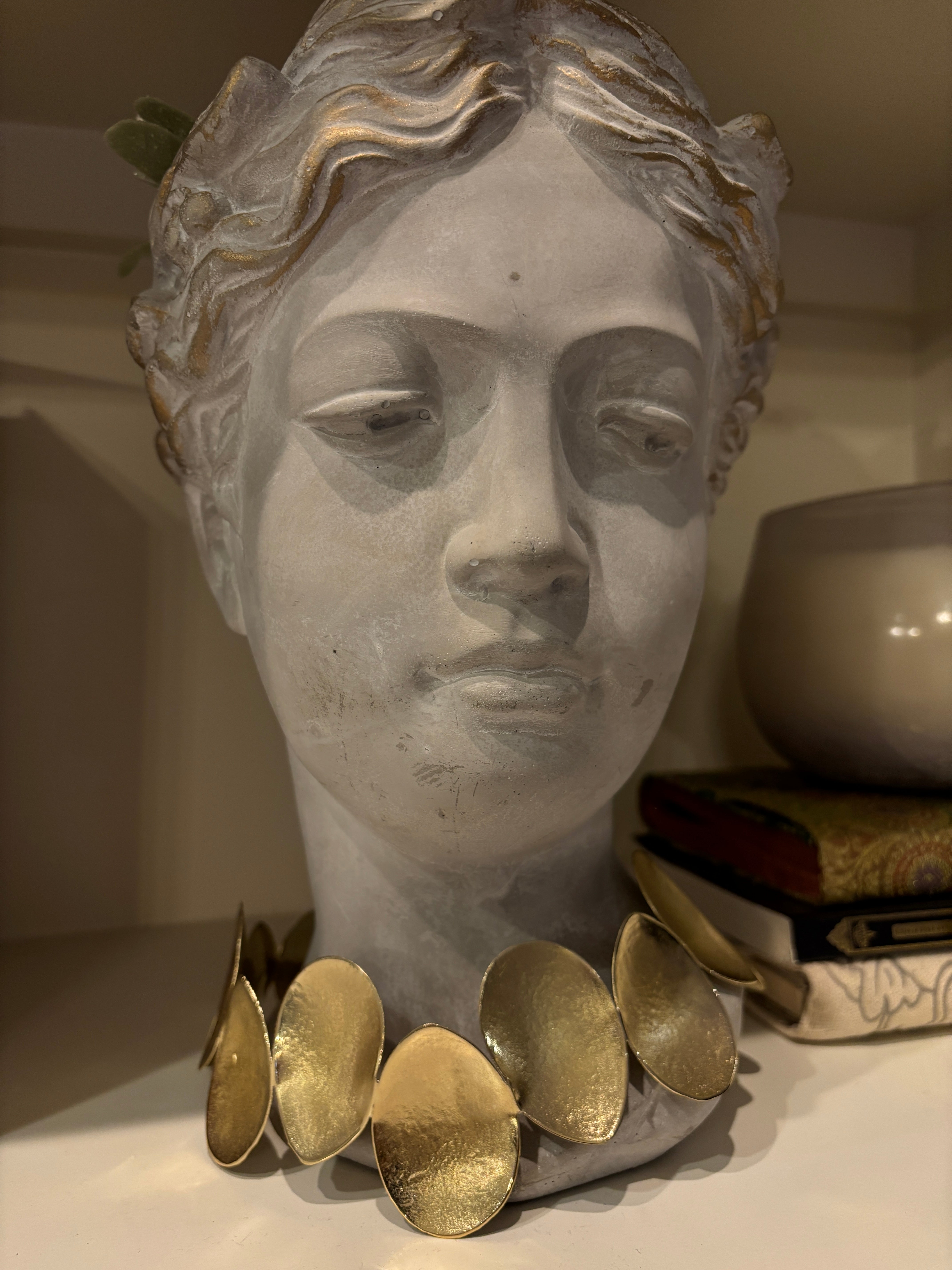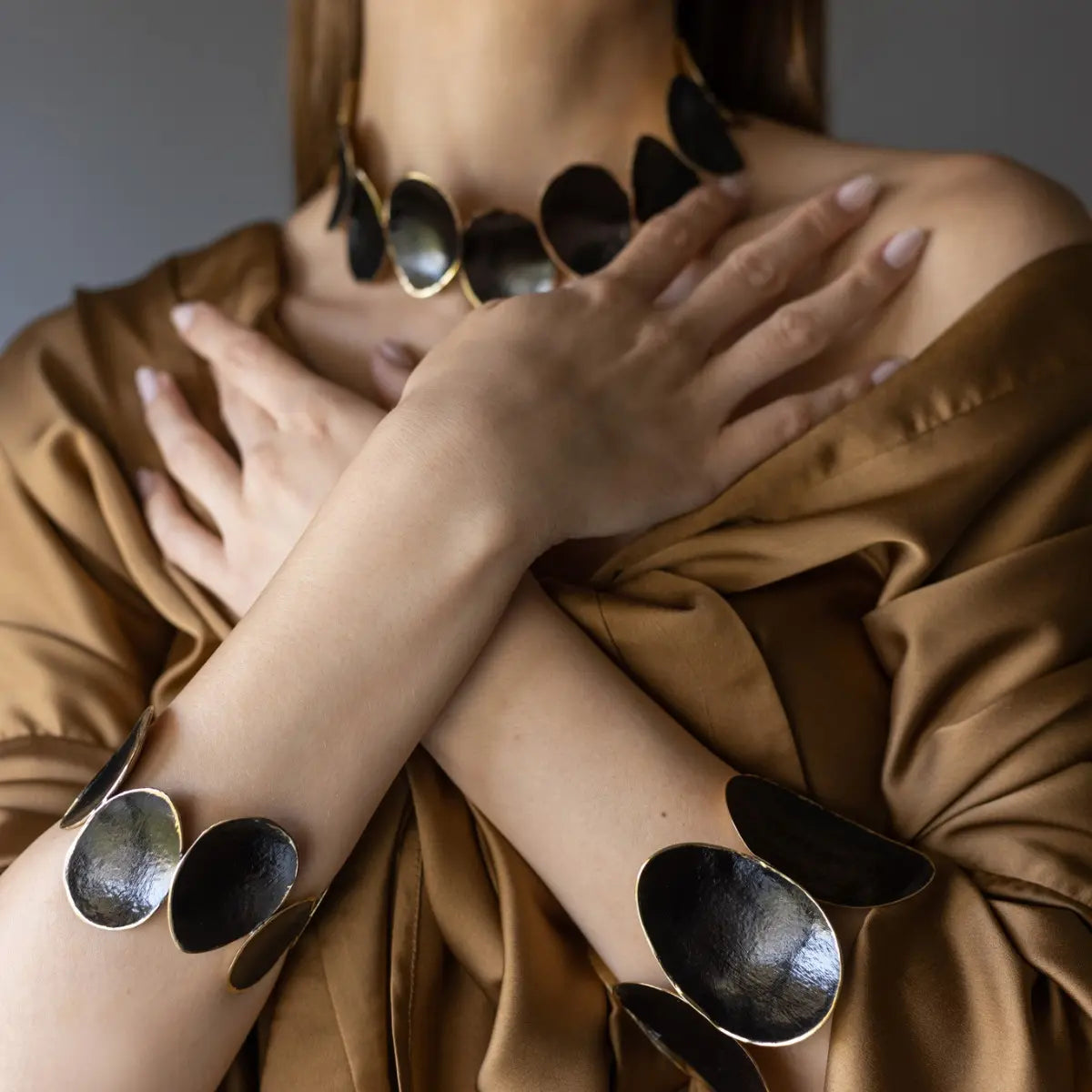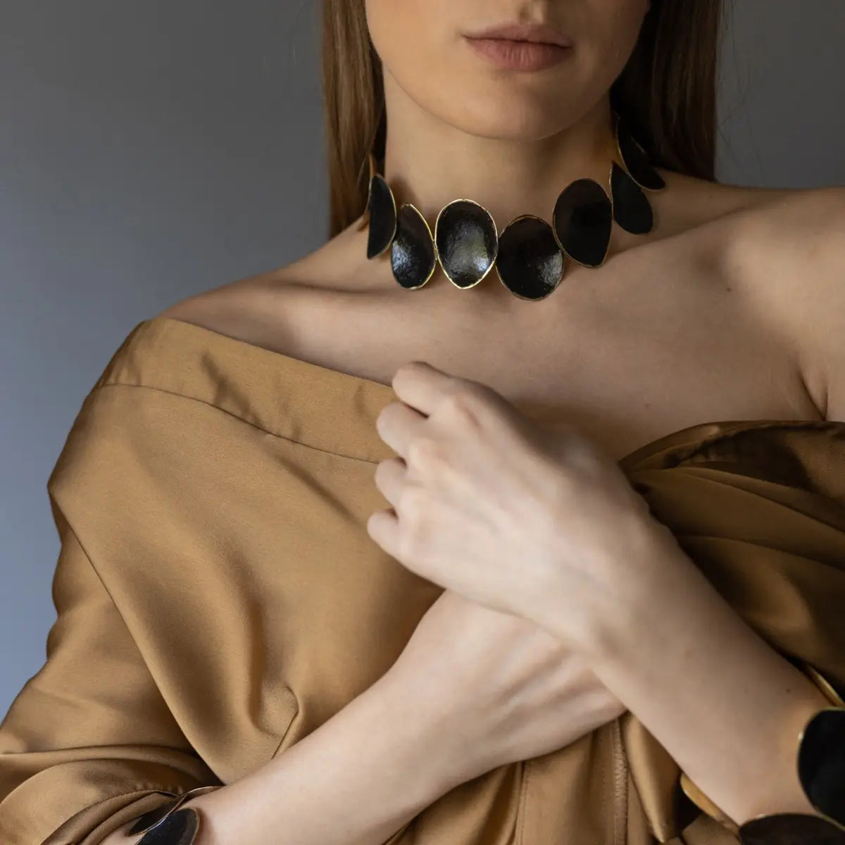 A radiant ode to unity, the Circles of Trust Choker showcases overlapping brass circles in a warm, golden finish. Its sculptural silhouette sits gracefully at the neckline, offering a striking focal point for any ensemble. A modern statement piece that effortlessly combines minimalism with a hint of bold elegance.
