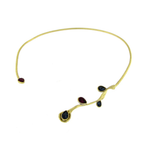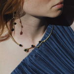 Graceful and fluid, the Eira Choker draws inspiration from nature’s quiet geometry — branches touched by frost, dew frozen into light. Hand-sculpted in brass, it winds gently around the neck, adorned with crystals that seem to bloom along its curve.