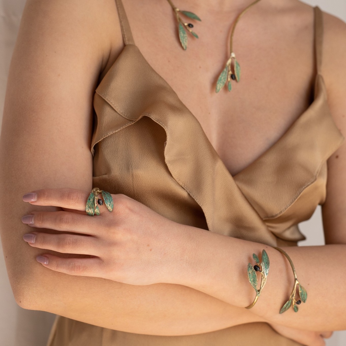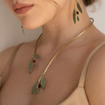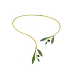 This open choker wraps gently around the neck, with hand-formed olive leaves and dark patina fruits at each end—evoking the timeless elegance of ancient groves. Crafted in brass with a signature green oxidation, each detail is painted by hand, giving the piece its unique, earthy character.