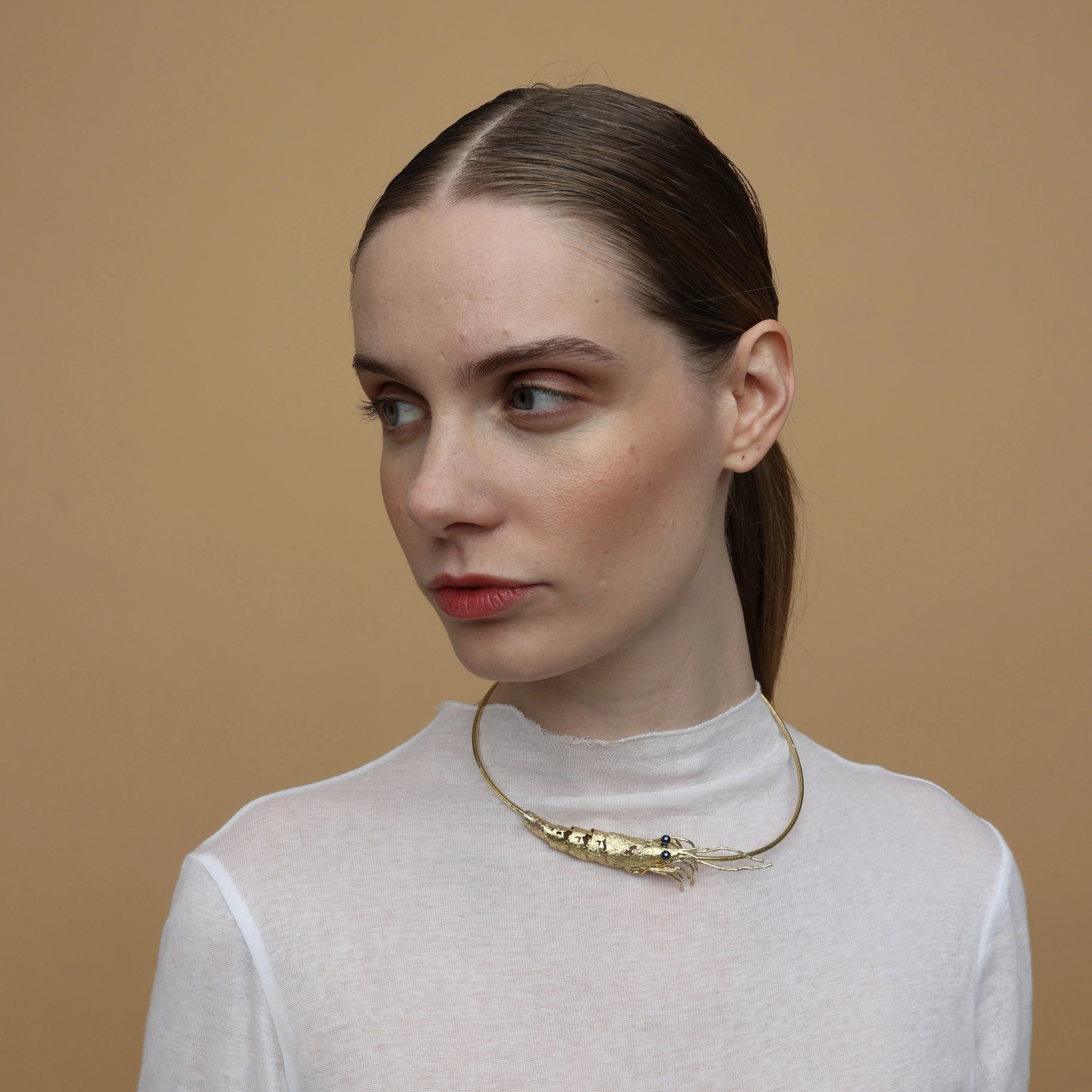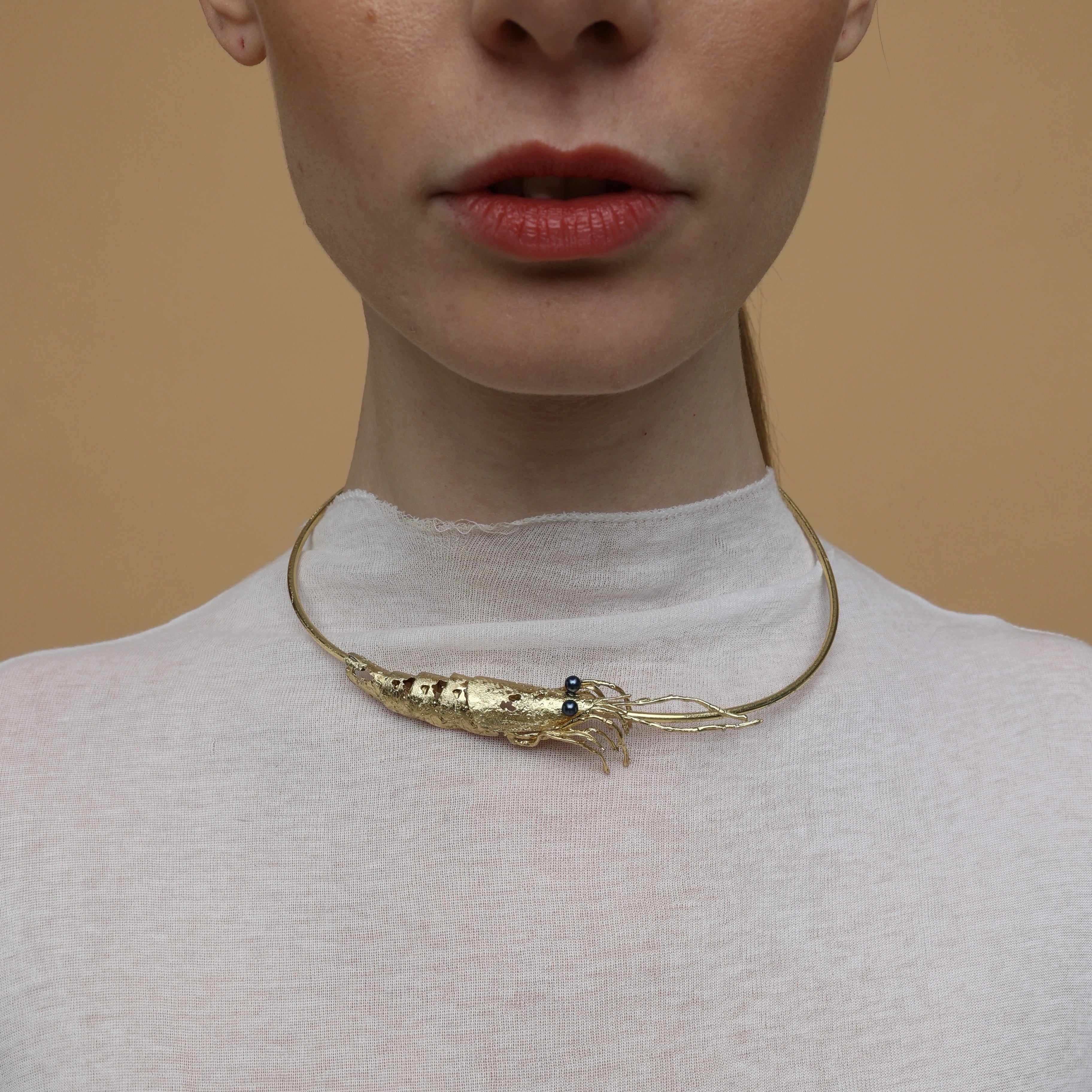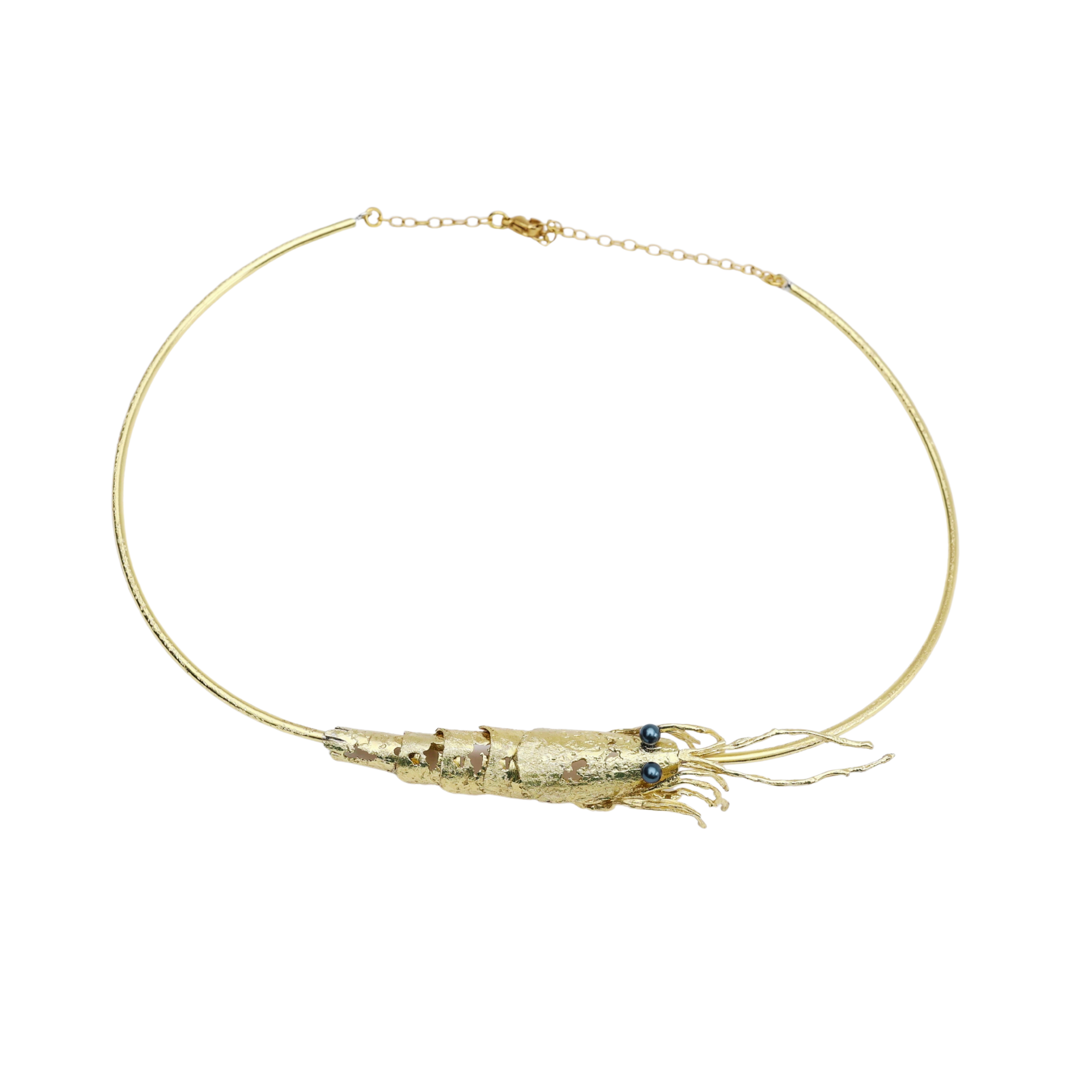 Channeling the same undersea elegance, this Sedna Shrimp Choker features deep blue pearls against a brass backdrop. Its adjustable construction and nickel-free design promise both style and everyday comfort.