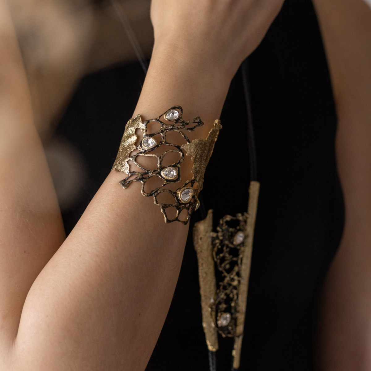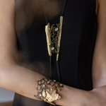 Hand-forged in brass with a striking black oxidation finish, this lariat drapes your neckline with an effortlessly cool vibe. White crystals catch the light with a subtle glow, adding a touch of delicate allure. Its adjustable length lets you style it as a long, cascading piece or a close-fitting choker—perfect for shifting with your mood. Hypoallergenic and nickel-free, it's crafted to be both comfortable and enduring, making it a versatile addition to your collection.