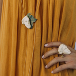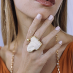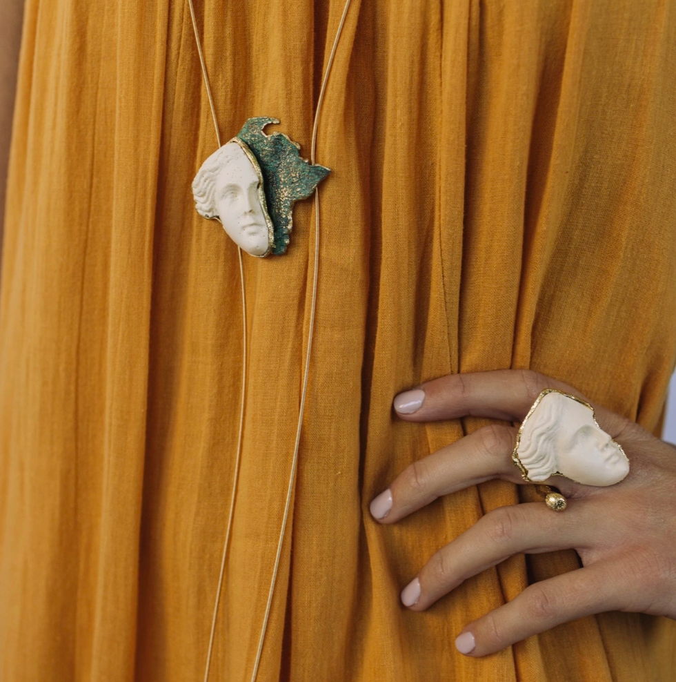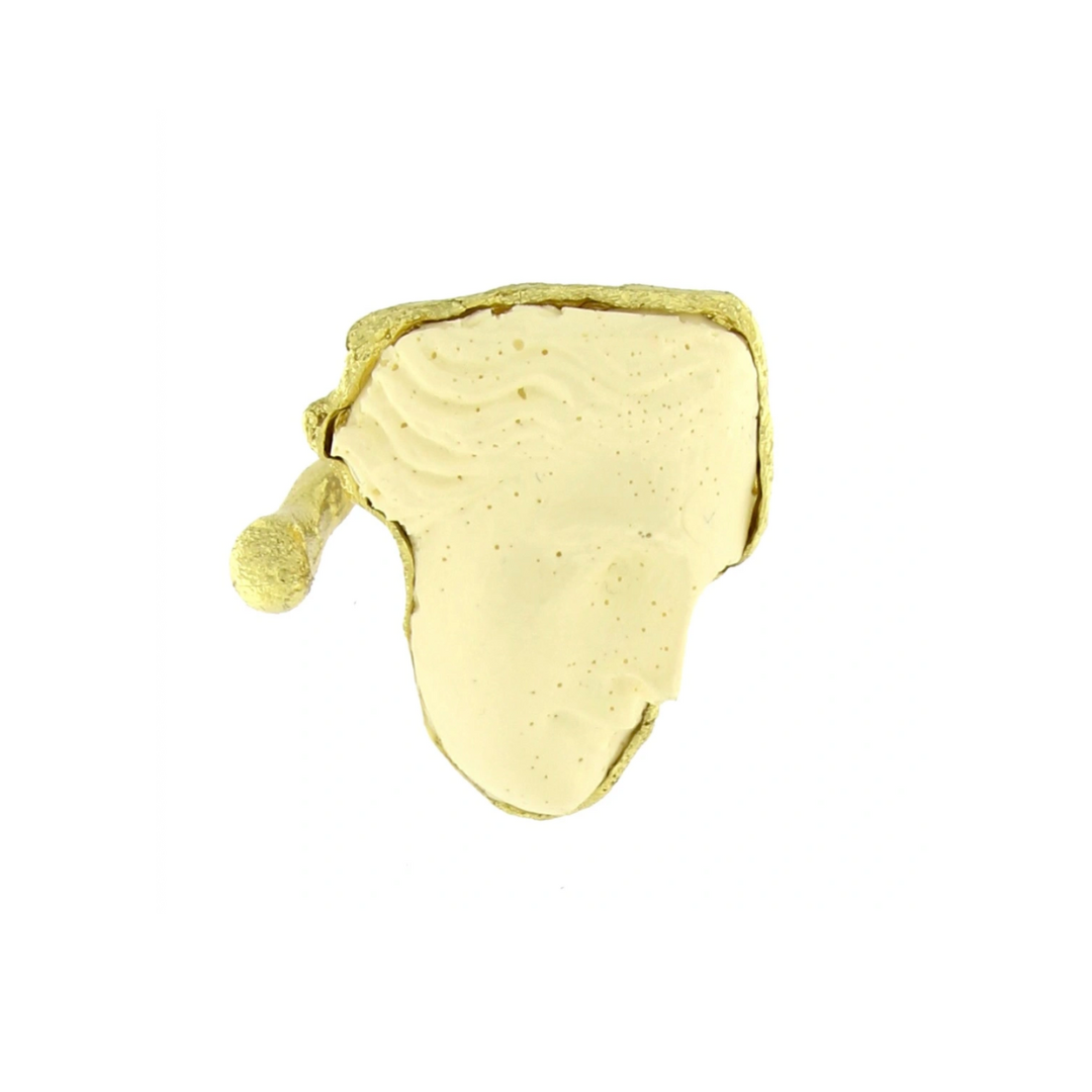 A bold tribute to classical beauty and the intimacy of imperfection. This statement ring captures the serene profile of Aphrodite, reimagined through a modern surrealist lens. Crafted in brass with a matte ivory resin stone, its gently fragmented form evokes the elegance of ancient sculpture unearthed and adored.