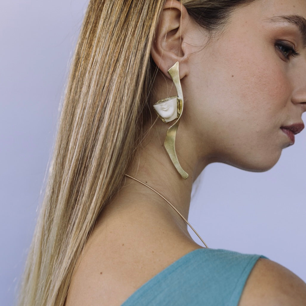 Elongated and artistic, these brass earrings carry the same split-face motif that embodies duality and hidden layers. Their sleek drop design sways gracefully with each step, making a bold statement of modern symbolism. Hypoallergenic, nickel-free, and built for enduring style, they’re a conversation starter for any occasion.