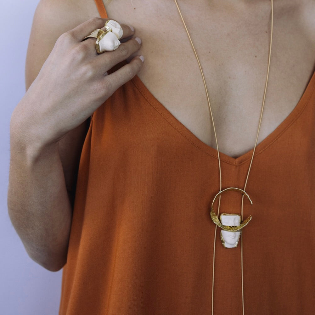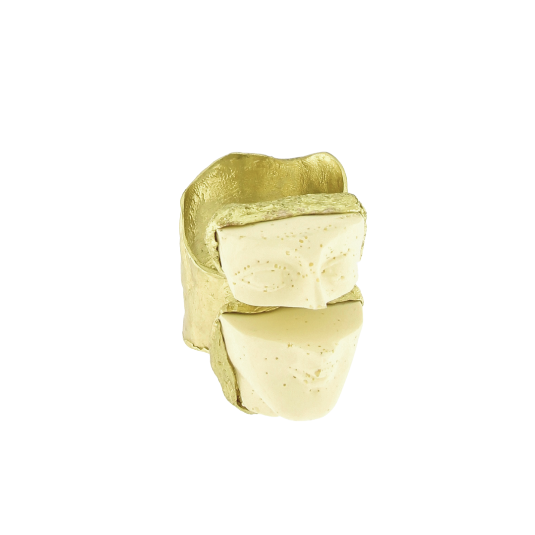 A striking fusion of art and symbolism, the Visage Split Ring features a sculptural face motif divided across a bold brass band. This split design suggests duality and hidden layers, making it a captivating statement piece. Hypoallergenic, nickel-free, and crafted for lasting wear, it’s a modern tribute to the complexities within us all.