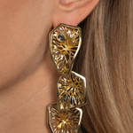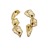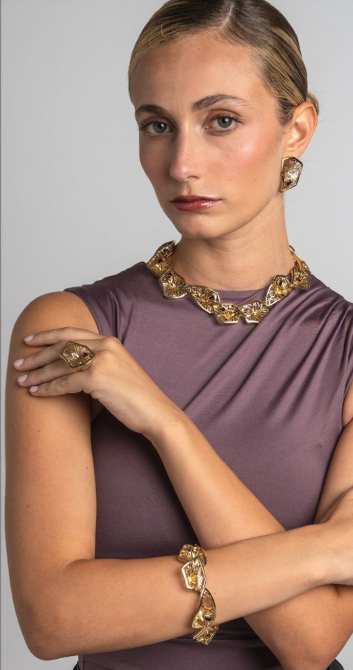 The Amara Cascade Earrings elongate the silhouette with a striking sequence of brass panels, each accented by rich amethyst crystals. Sculptural and expressive, they move with grace — a modern heirloom for lovers of statement jewelry.