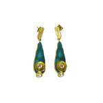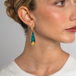 The Arden Earrings echo the bracelet and ring, suspending blue resin stones within warm brass frames. White crystals add brilliance, while the sculptural design keeps them bold but balanced. Made to frame the face with elegance and strength.