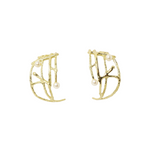 The Cressida Earrings are a study in contrasts — bold brass lattices curve with sculptural precision, while luminous pearls rest like droplets of light across the form.