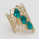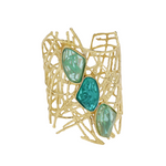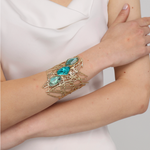 The Dione Cuff is a statement of light and depth, sculpted in brass with an open latticework that feels as natural as branches and as deliberate as art. Three striking turquoise-hued crystals anchor the design, their facets glowing like captured drops of sea and sky.